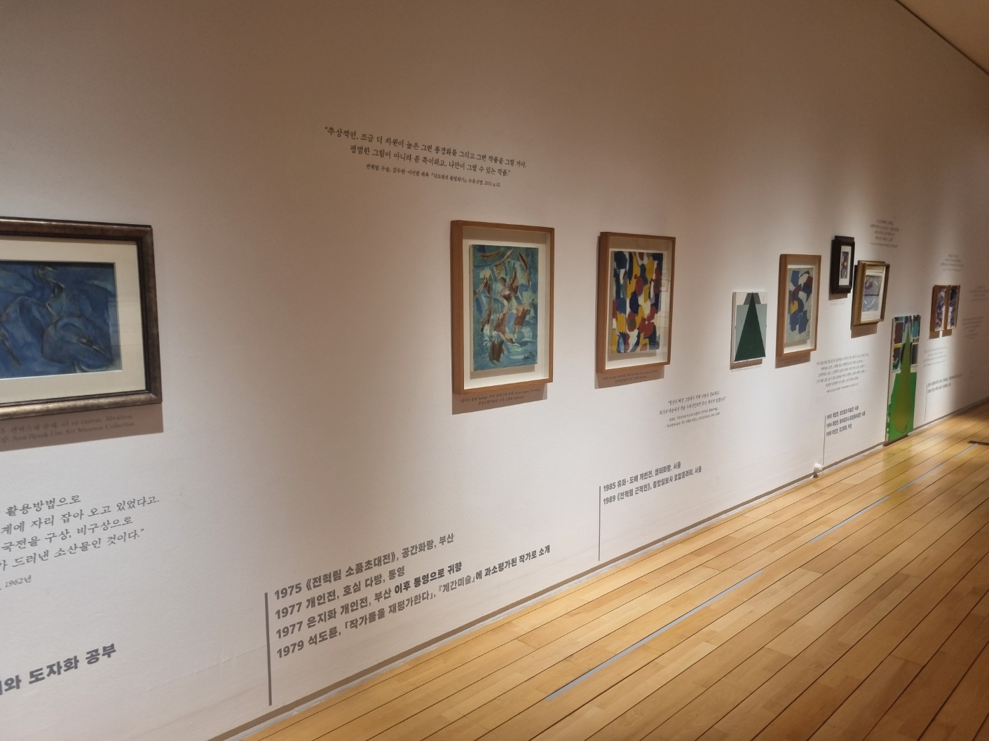 전혁림(1915~2010), 이성자(1918~2009), 이준(1919~2021)은 추상미술의 전후관계 속에서 한국 추상미술의 특징인 자연을 모티브로 한 서정적 추상을 추구합니다. 통영, 진주, 남해 등에서 어린 시절을 보낸 이들은 스스로 존재하거나 하늘, 바다, 육지, 해나 달 등 우주 속에서 자연적으로 발생하는 상태인 '然'의 모습을 부정하지 않고 그 속에서 예술가의 정신작용을 이용해 본질적인 요소를 추출합니다. 이는 자연과 인간을 하나의 통일된 세계로 받아들이는 동양의 사상에 기인하며, 이성자가 민화, 자수, 목공예 등 전통문화를 차용한 것, 이성자의 빛으로 구분되는 무한한 수의 색채에 의해 추상화되는 조형적 특성의 근간이라고 할 수 있습니다. 또한 전시는 연기와 융합으로 전현선의 그림, 오유경의 연결과 중첩으로 설치, 분할과 뺄셈으로 조재영의 조각이 이전 세대의 작품을 접하고 기존 추상의 가치를 전도하여 새로운 이야기의 추가를 유도하는 일종의 추상적 실험입니다. 또한 전시는 전혁림과 전현선의 개념과 추상, 이성자와 오유경의 여성과 지구와 우주의 연결, 이준과 조재영의 일상적인 뺄셈과 나눗셈이 서로 짝을 이루다가 분리되어 추상의 전통적인 의미를 느슨하게 하고 때로는 견고하게 결합하는 일종의 추상적 실험입니다