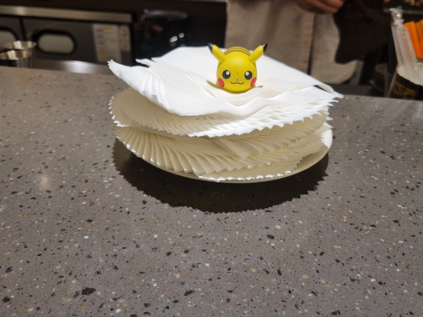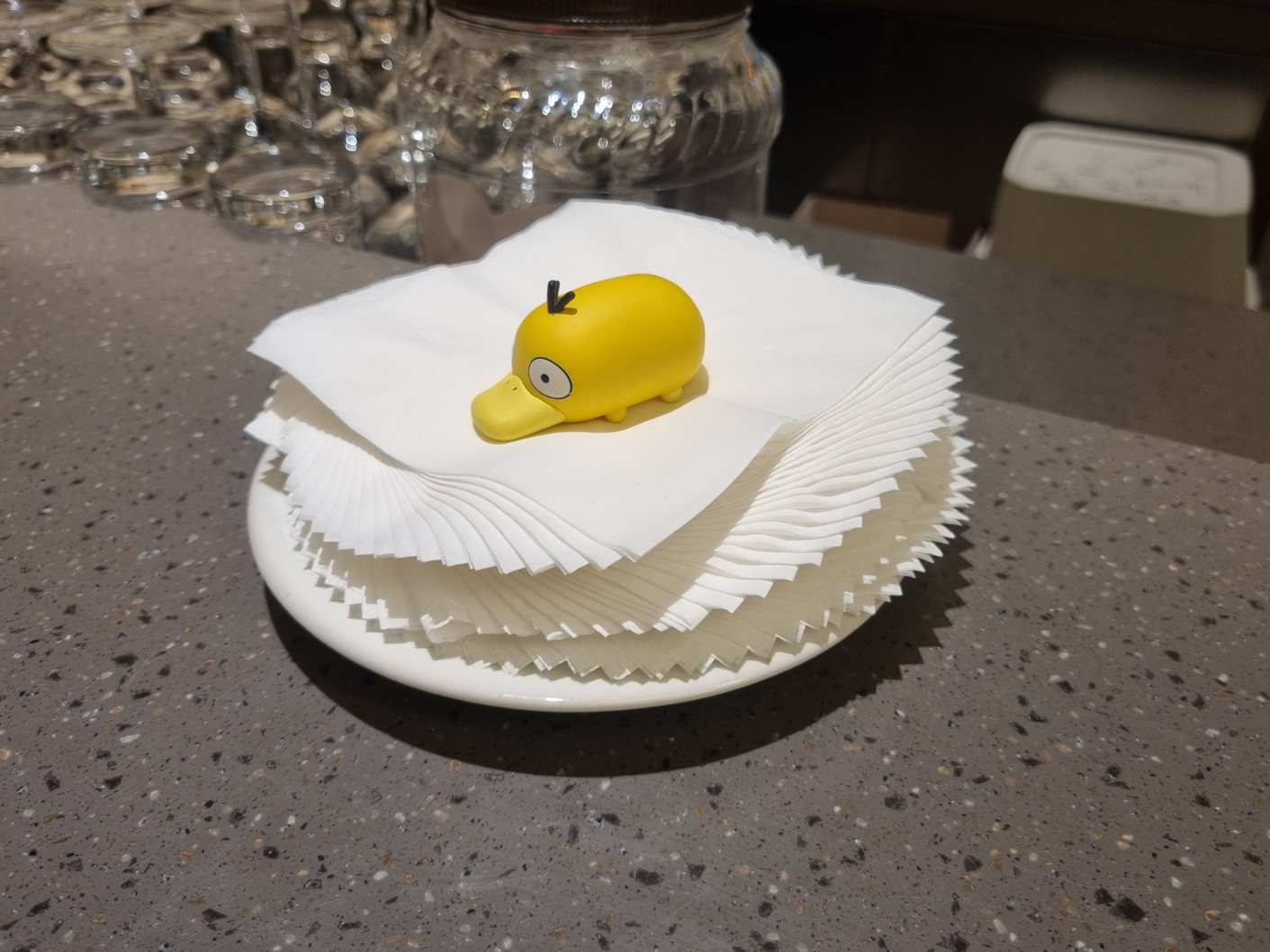 냅킨위에 고라파덕이랑 피카츄 피규어가 있다.