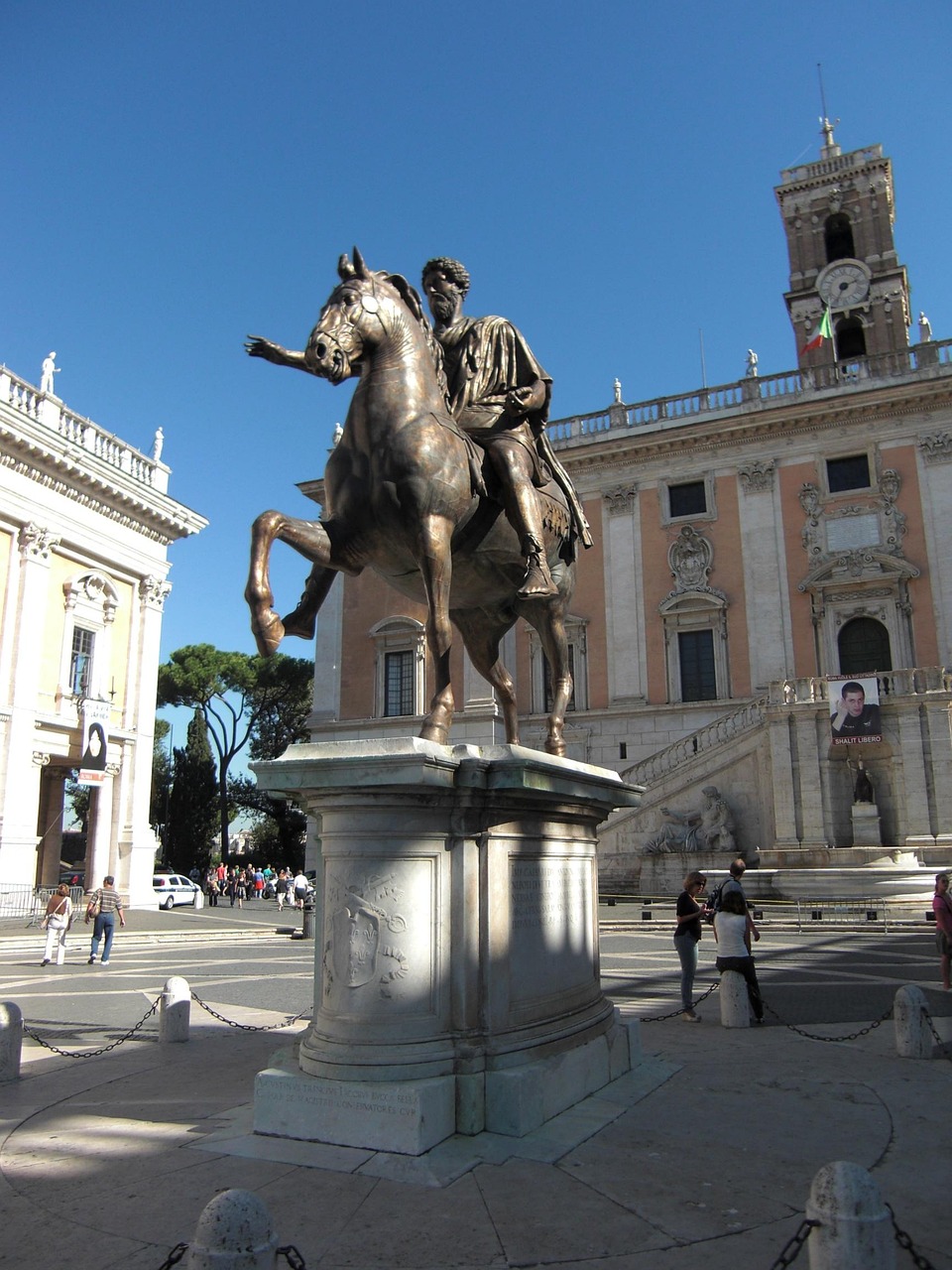 ① 마르쿠스 아우렐리우스 동상 현관 중앙에는 로마 최고의 독재자 중 한 명인 마르쿠스 아우렐리우스 황제의 감동적인 인용 동상이 있습니다 . 이 동상 은 복제품 으로 원본 은 카피톨리노 갤러리 에 보관되어 있습니다 .이 승마 기념물은 로마 황제의 지혜 , 리더십 및 지속적인 유산을 상징합니다 .