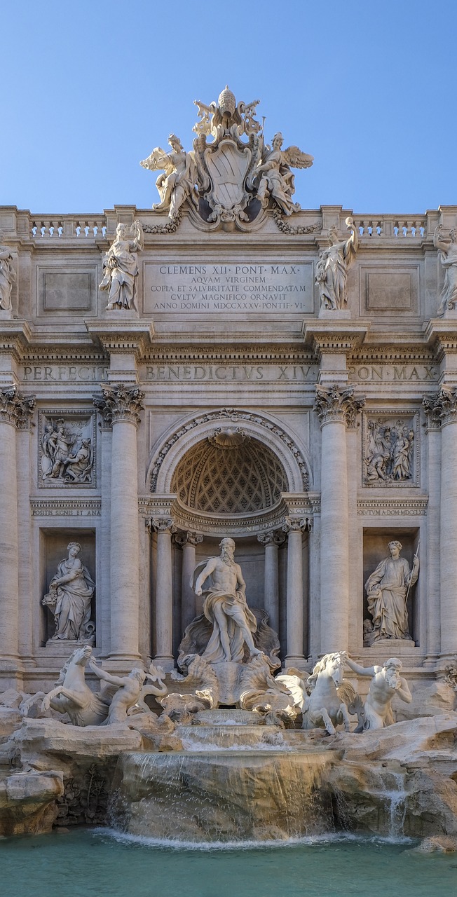 트레비 분수의 가장 중요한 점은 물론 다음과 같습니다. 물. 뿌리는 *아쿠아 처녀자리* 도관에 의해 공급되며, 이 도관은 뿌리를 통해 흐르는 물을 오늘날까지 계속 공급합니다. 물은 일련의 극적인 낙하로 인형에서 흘러내리며 움직임과 소리의 매혹적인 디스플레이를 만들어냅니다. 뿌리 밑부분에 있는 큰 블록 모양의 수영장은 전통적으로 로마로 돌아가는 임시 방편에 동전을 던지는 곳입니다.