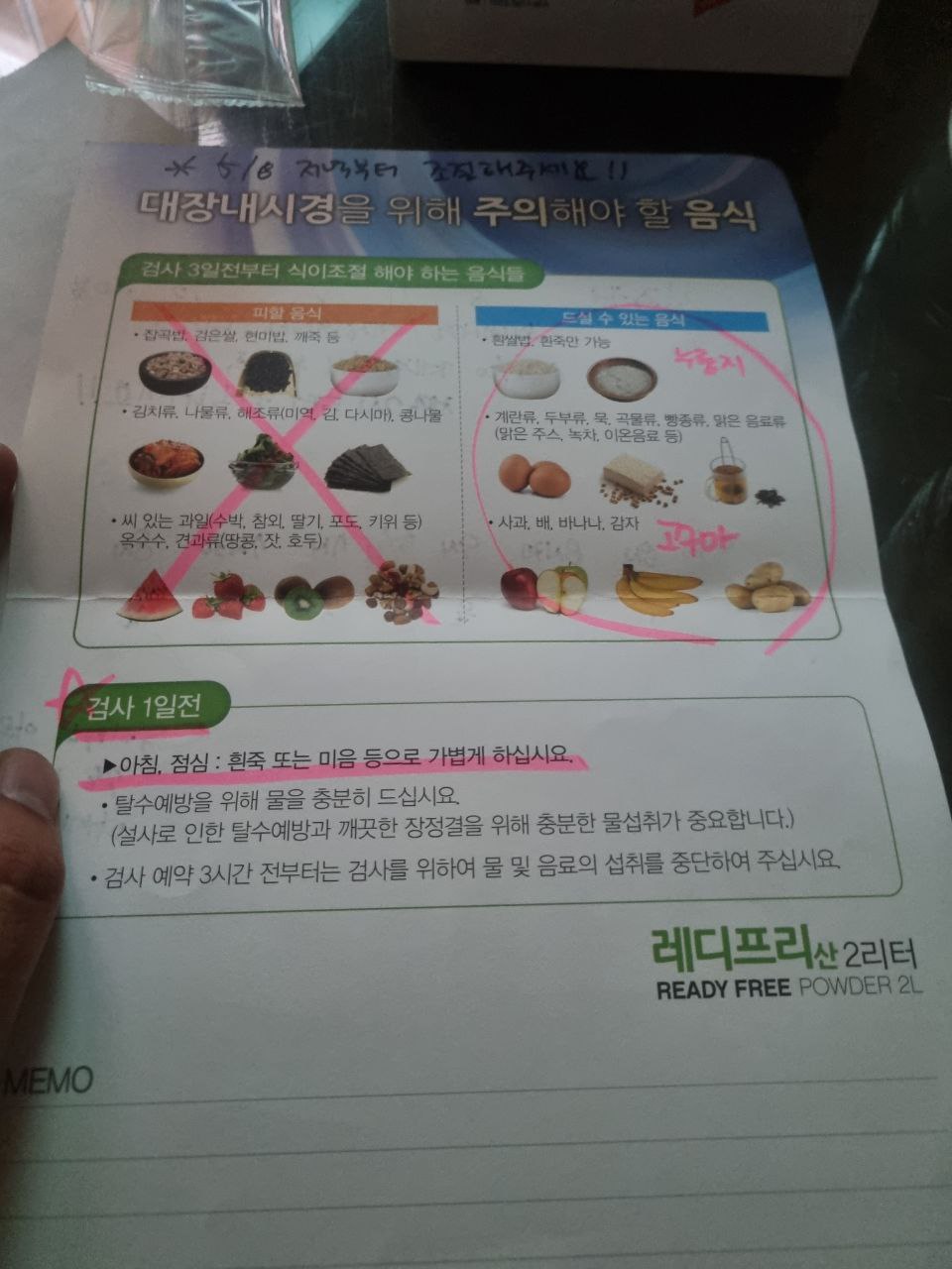 바로 상담받고 내시경예약을 잡고 , 간호사님이 내시경을 하기위해 3일전에 주의사항을 설명해주고 약과 통을 받았습니다.