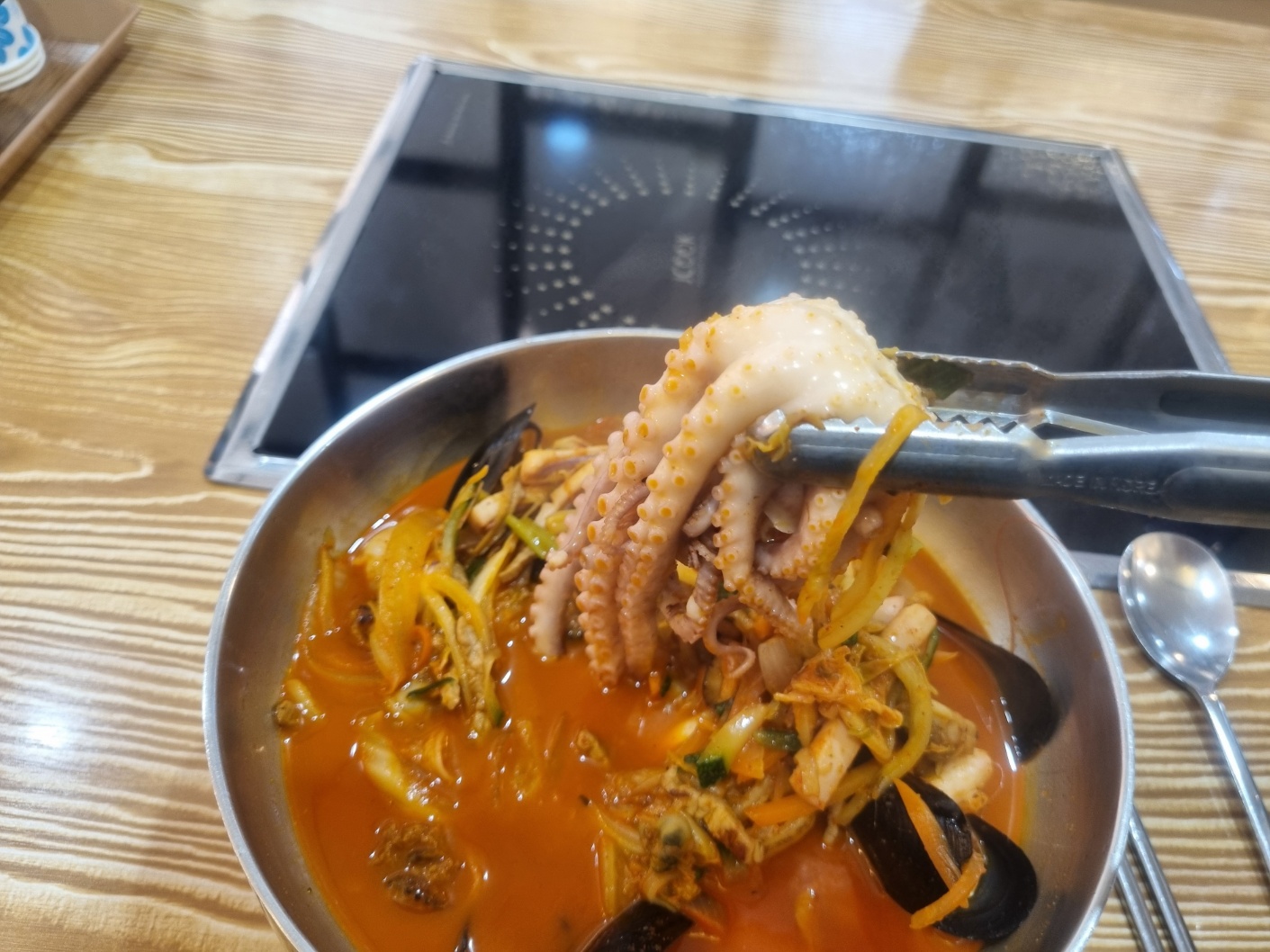 낙지 1마리를 통째로 넣어주고 새우 2개도 넣어주신다.
