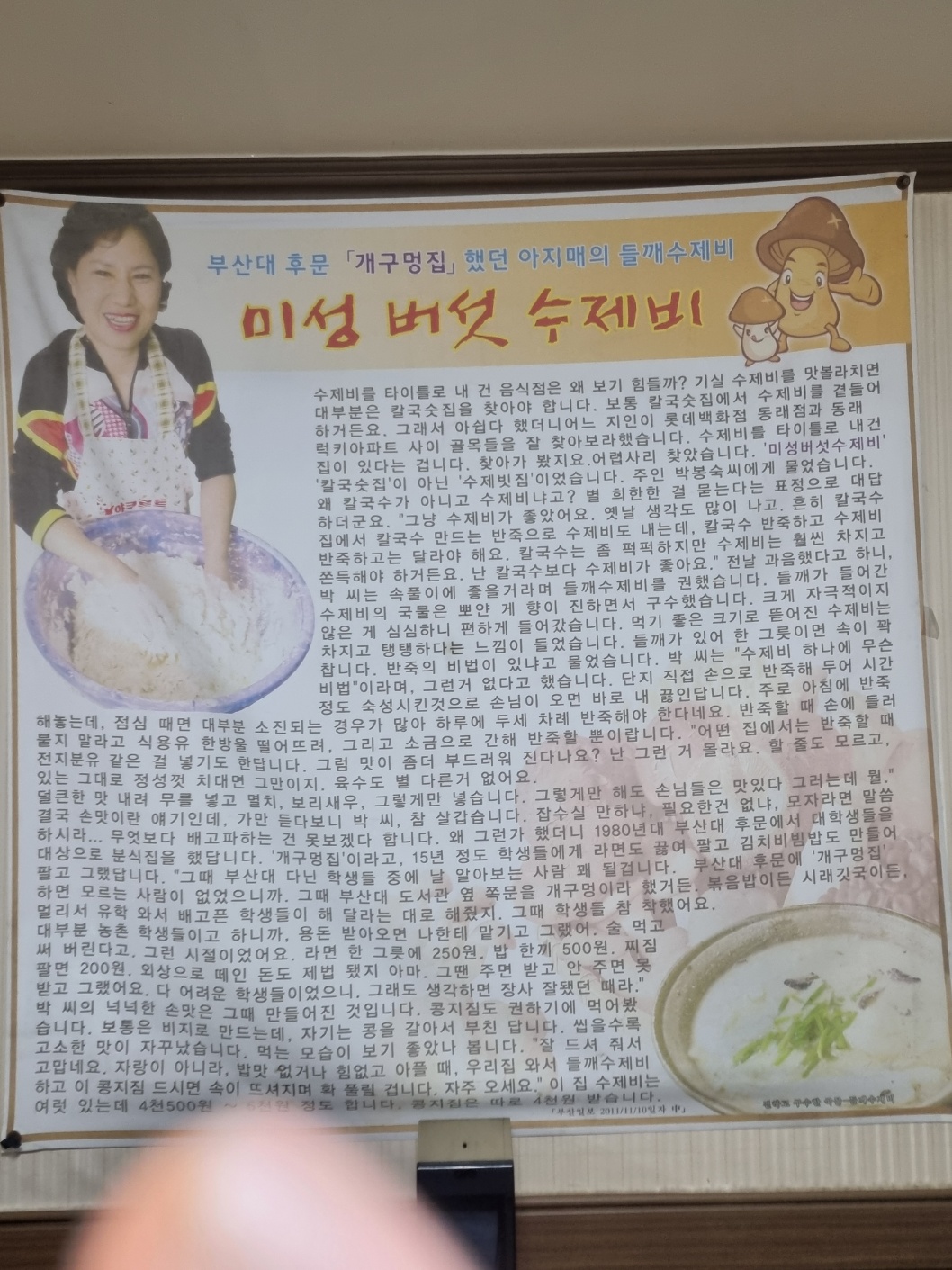 미성수제비가 부산대있을때 부터 시작한 스토리가 옆에 붙어 있다.