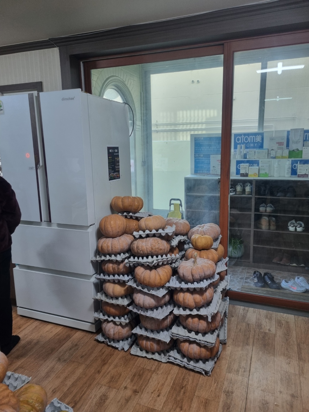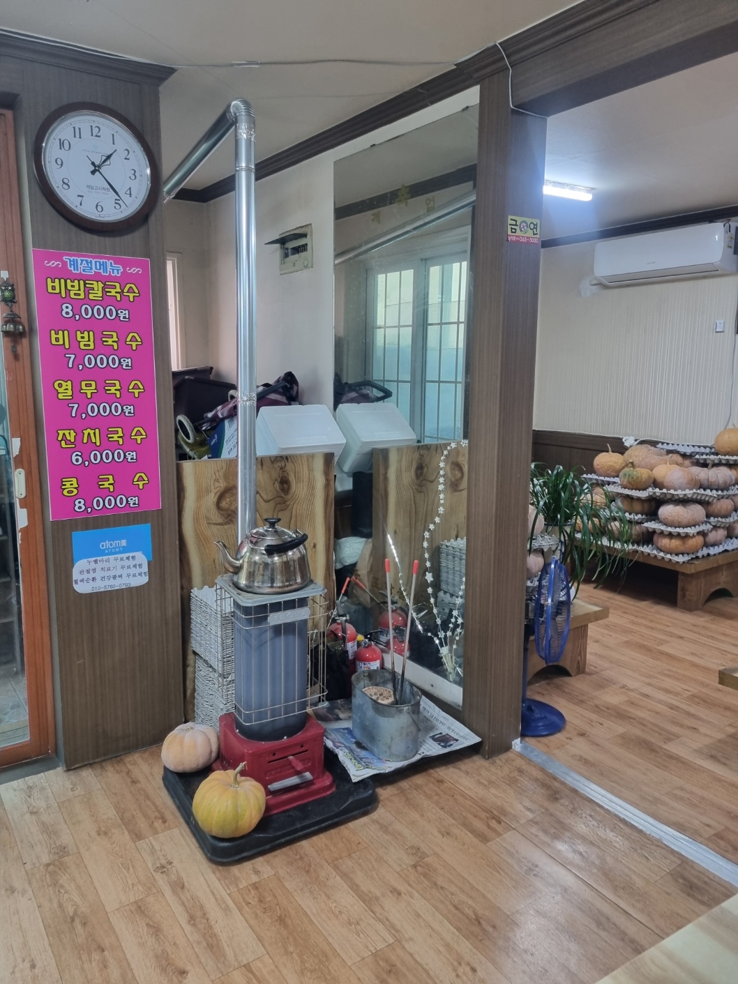 옛날 감성을 더하여 옆에는 연료난로와 호박이 쌓여 있다.