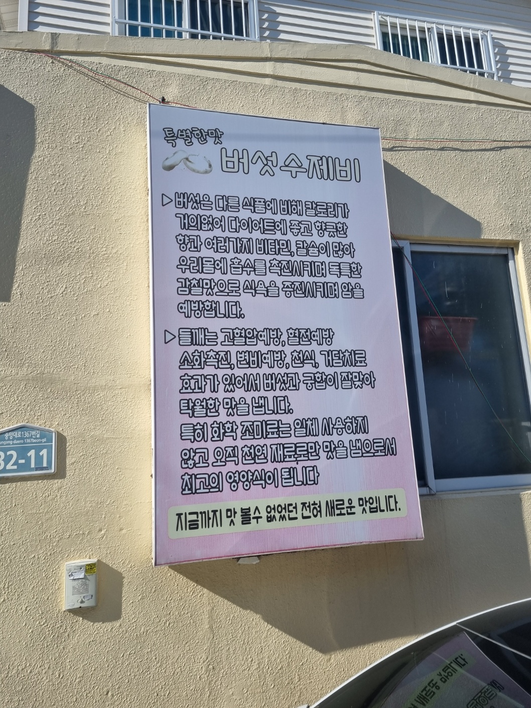 가게 앞에는 버섯의 효능에 대해 알려주고 있다.