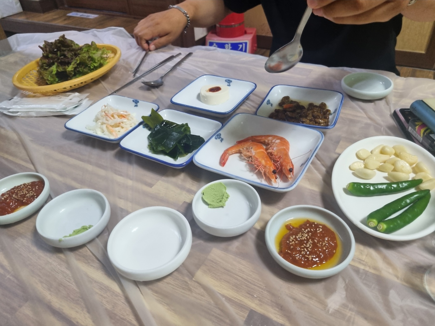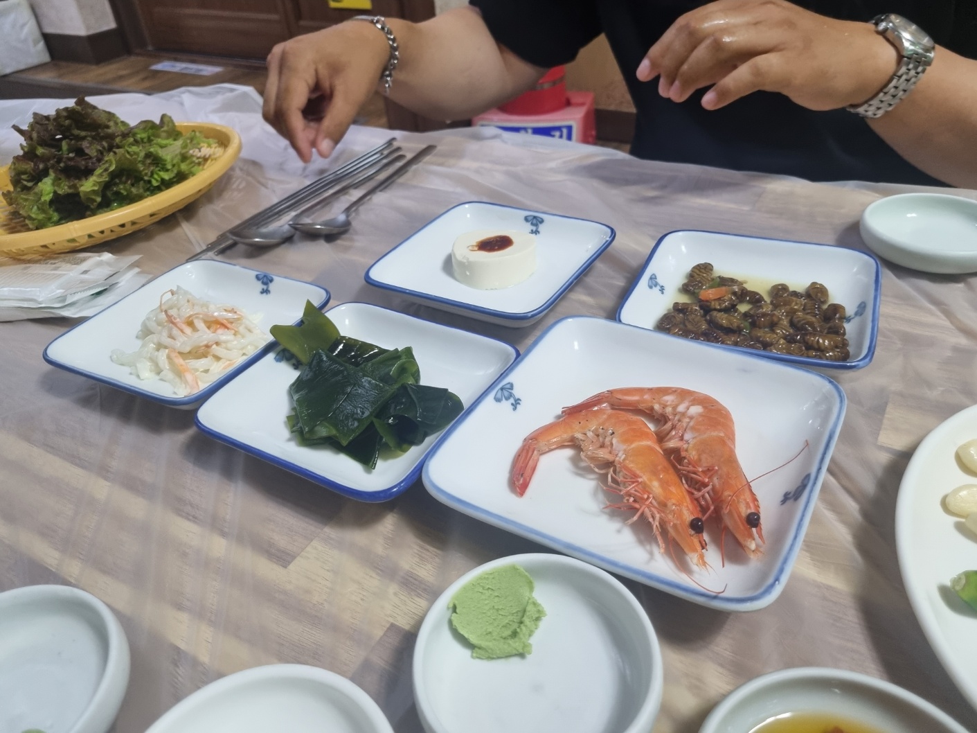 상차림을 세팅했는데 포항상회에서 서비스로 준 새우와 멍게