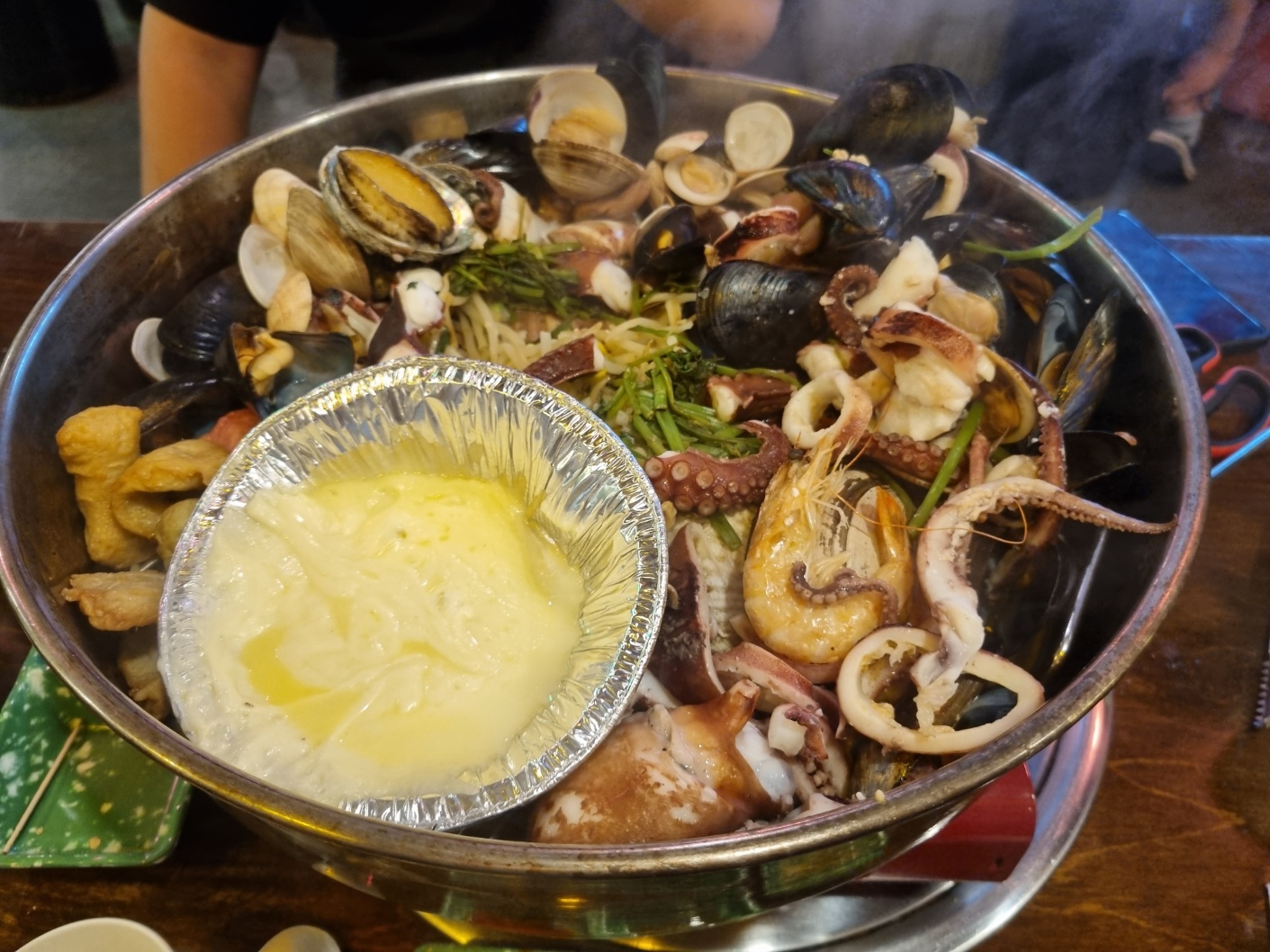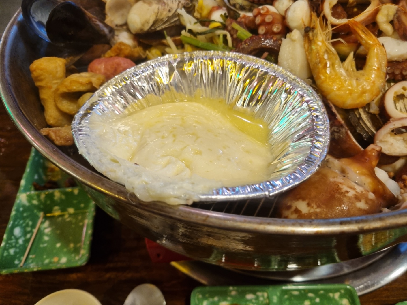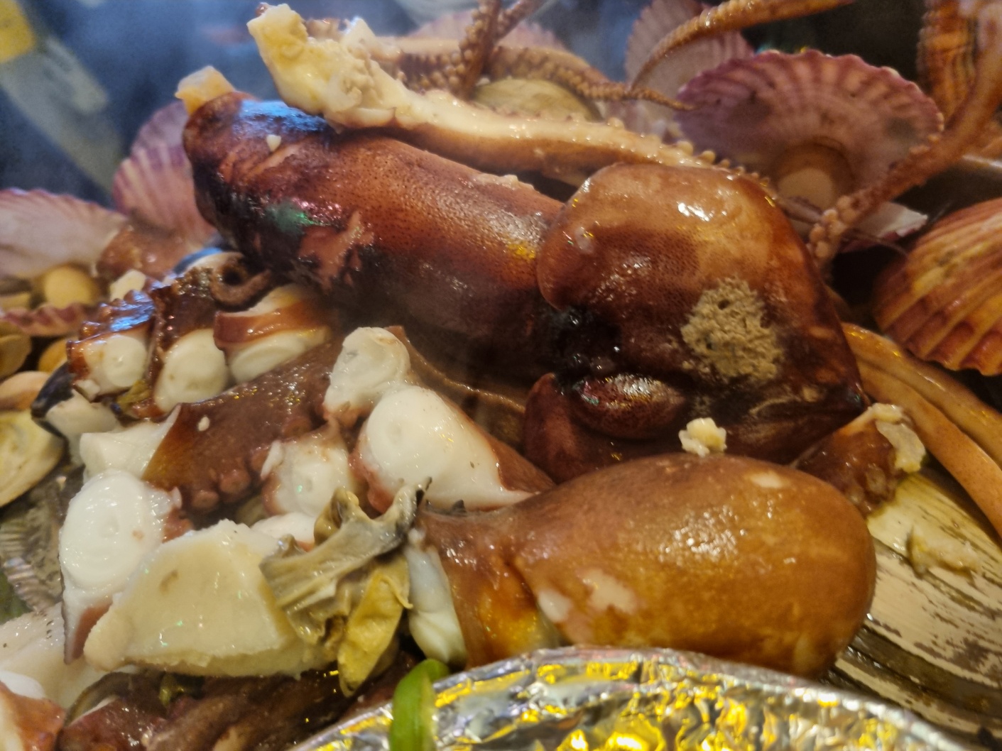 조개찜 안에는 문어, 오징어, 키조개, 가리비, 홍합, 전복등 여러가지 해산물이 들어있다.