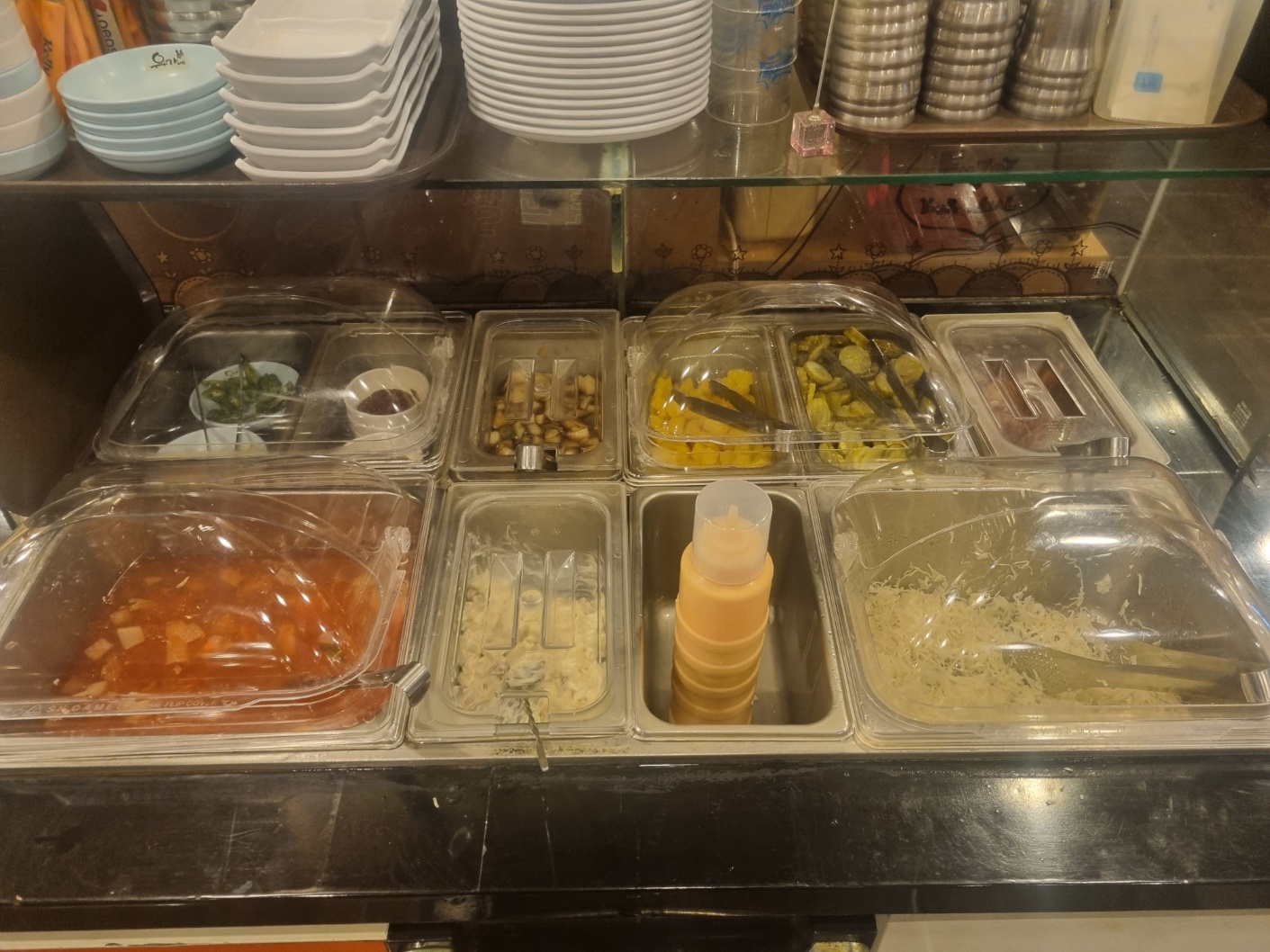 셀프코너에 앞치마와 사라다 , 샐러드 , 동치미국, 피클등이 있네요