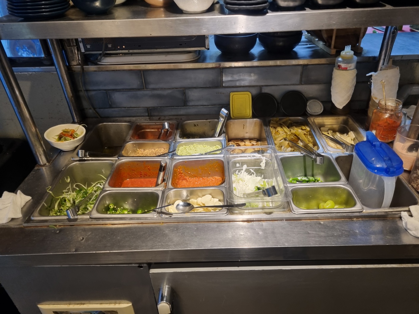 다양한 소스와 샐러드가 구비되어 있습니다.
