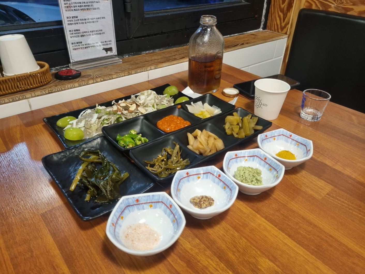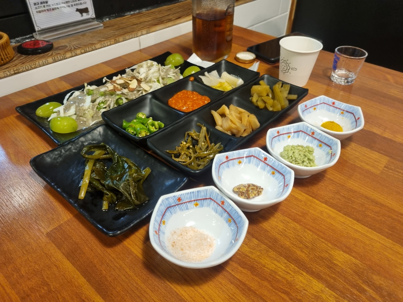 먼저 다양한 소스와 명인나물거리, 샐러드 가 먼저 나오고나서