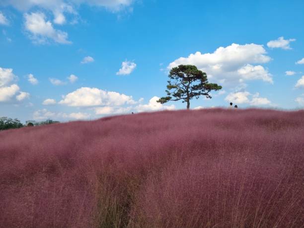 핑크 뮬리 들판 – 이번 시즌의 하이라이트! 은은한 분홍빛 잔디가 넓게 펼쳐진 들판이 바람에 흔들리며 몽환적이고 구름 같은 풍경을 만들어냅니다.
