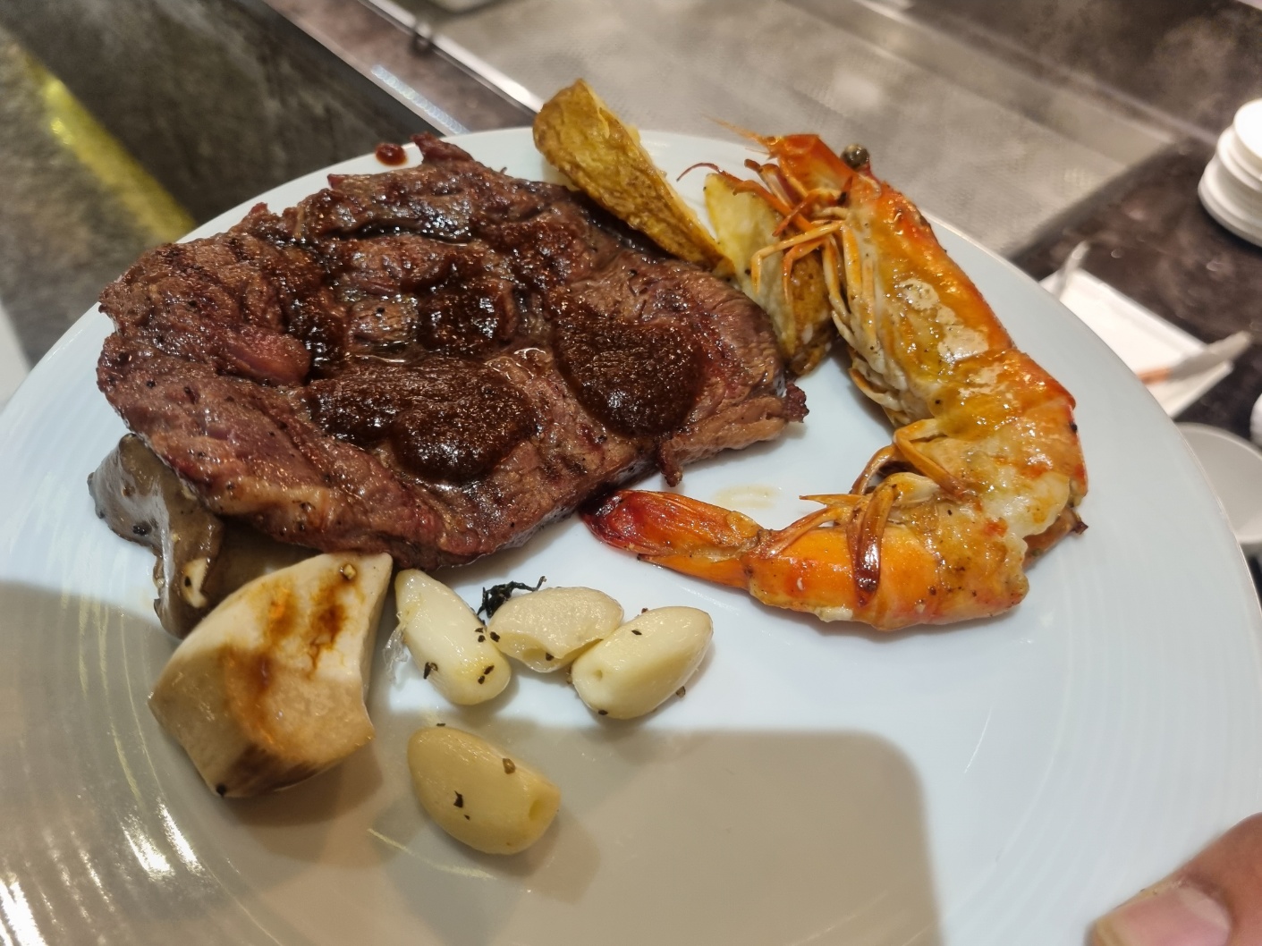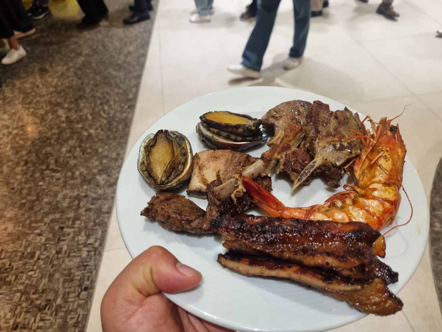 뷔페의 메인메뉴 !!! 새우구이, 전복, 돼지갈비, 소양념갈비, 양갈비, 부채살을 받았다.
