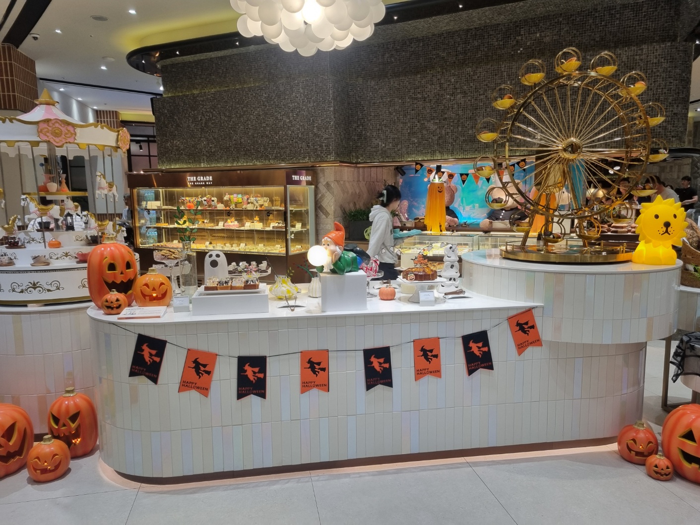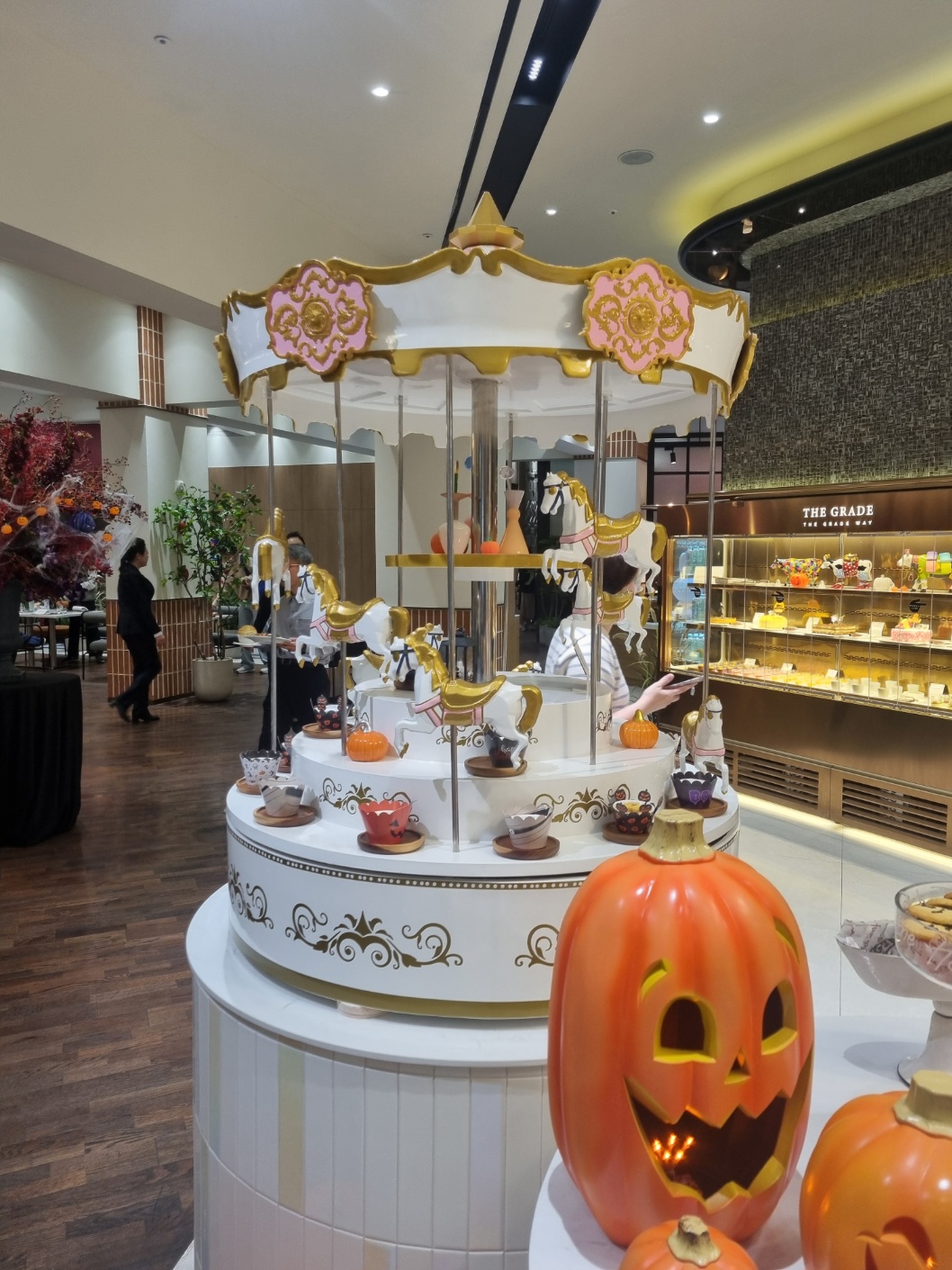 회전목마와 관람차 뒤쪽에 푸딩과 약과타르트, 꼬깔 초코, 치즈, 케이크 가 배열되어 있다.