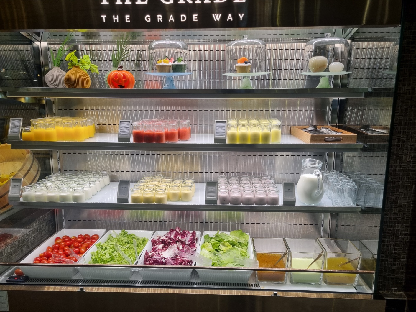 오른쪽으로 오면 과일주스와 우유가 있고 샐러드 재료들, 소스까지 배열되어 있다.