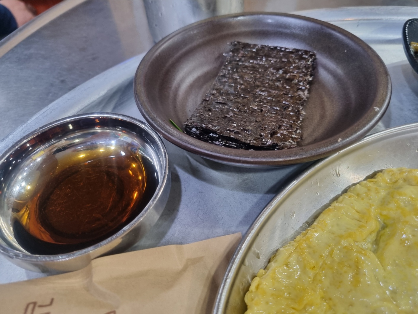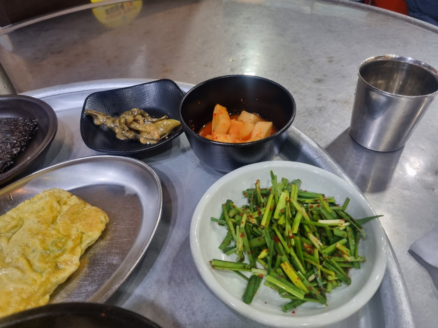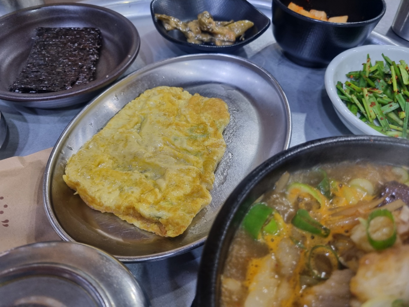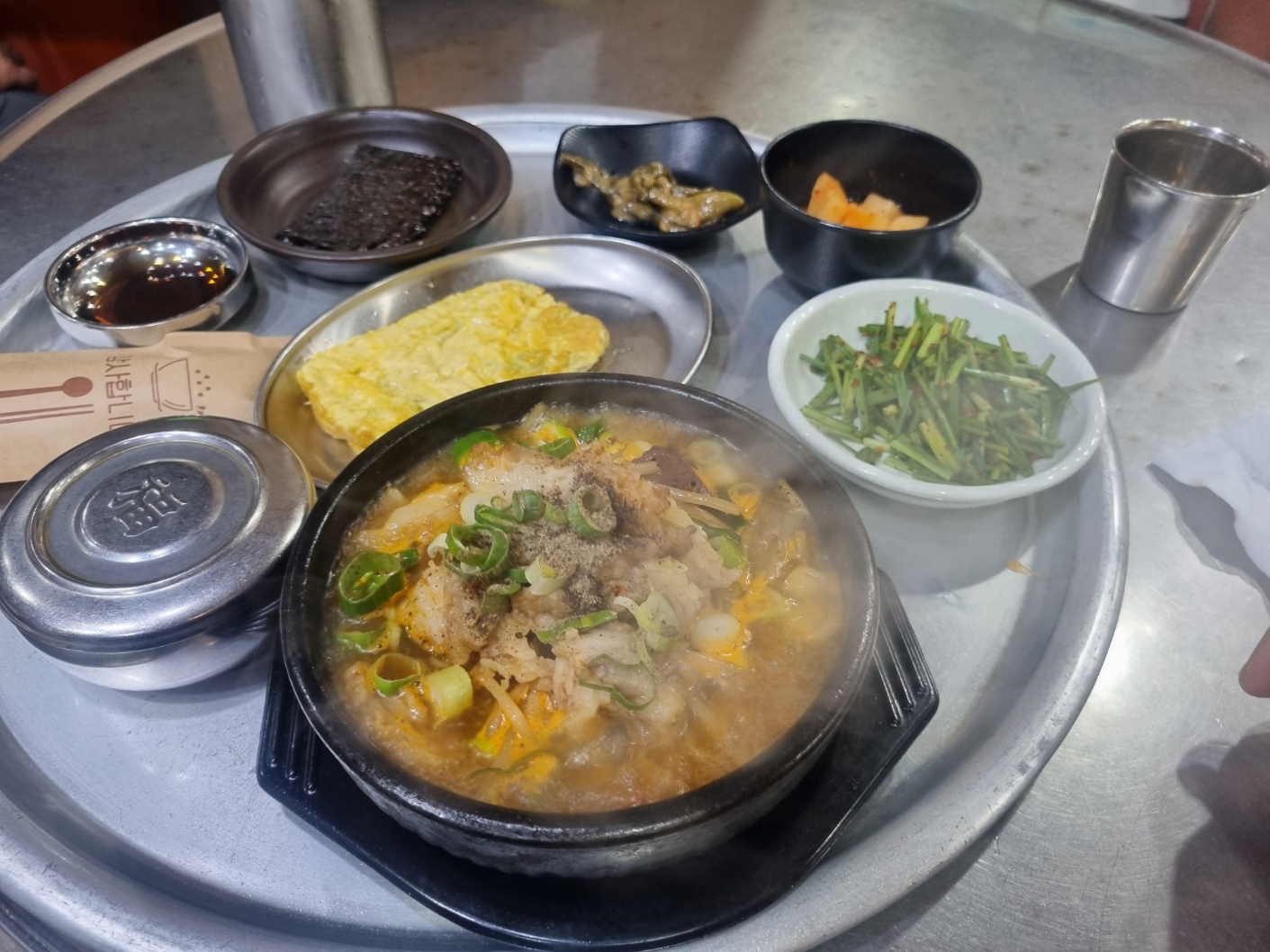 국밥과 나온 반찬들 왕계란말이랑 김이랑 같이 싸먹으라고 주셨다.