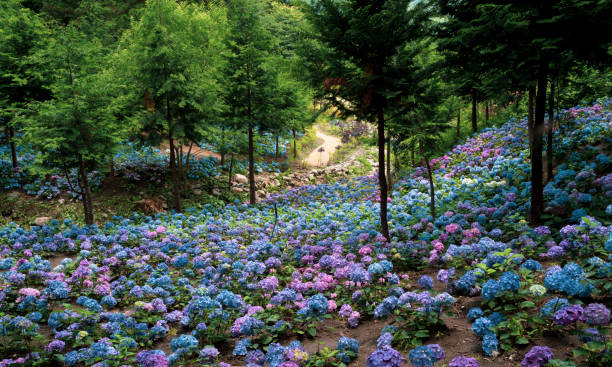 이순신공원의 수국은 보랏빛, 연분홍빛, 청량한 흰색 등 다양한 색상으로 피어나며, 바다와 어우러져 환상적인 풍경을 자아냅니다. 수국은 토양의 산도에 따라 색상이 달라지며, 산성 토양에서는 청색, 알칼리성 토양에서는 붉은색의 꽃이 피는 특징이 있습니다.