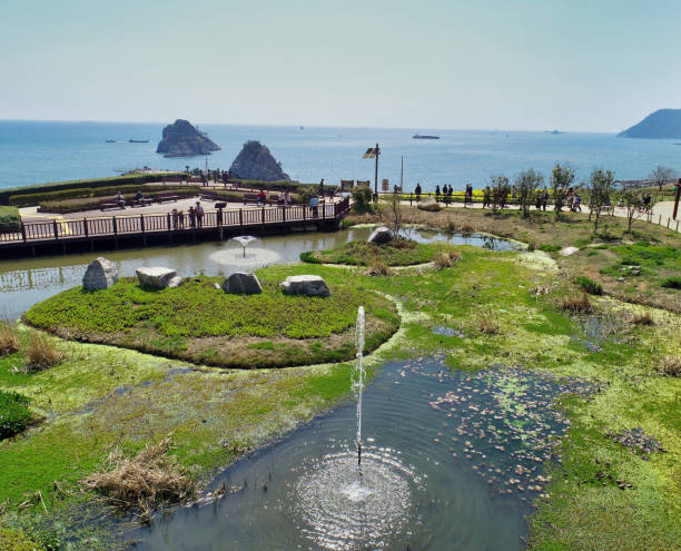 빨강, 분홍, 노랑, 하얀색 등 다채로운 장미꽃들이 연못과 산책로를 따라 피어나며, 푸른 여수 바다를 배경으로 장미를 감상할 수 있는 환상적인 풍경을 자아냅니다.
