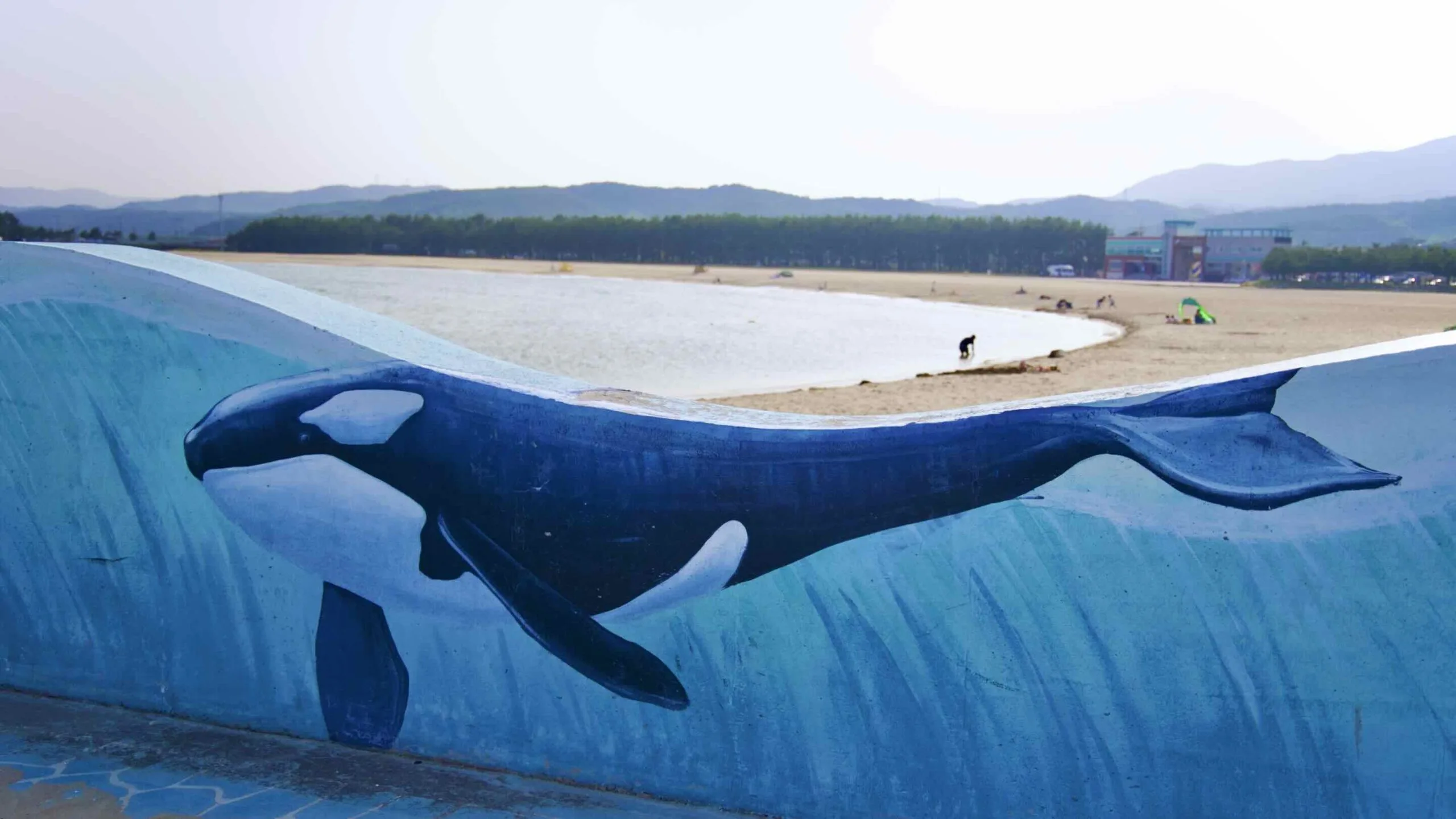 해변 입구에는 해학적인 고래 모양 메탈 조형물과 고래전망대, 고래 인증센터가 있어 사진 스폿으로 인기가 높습니다