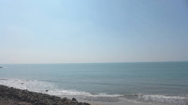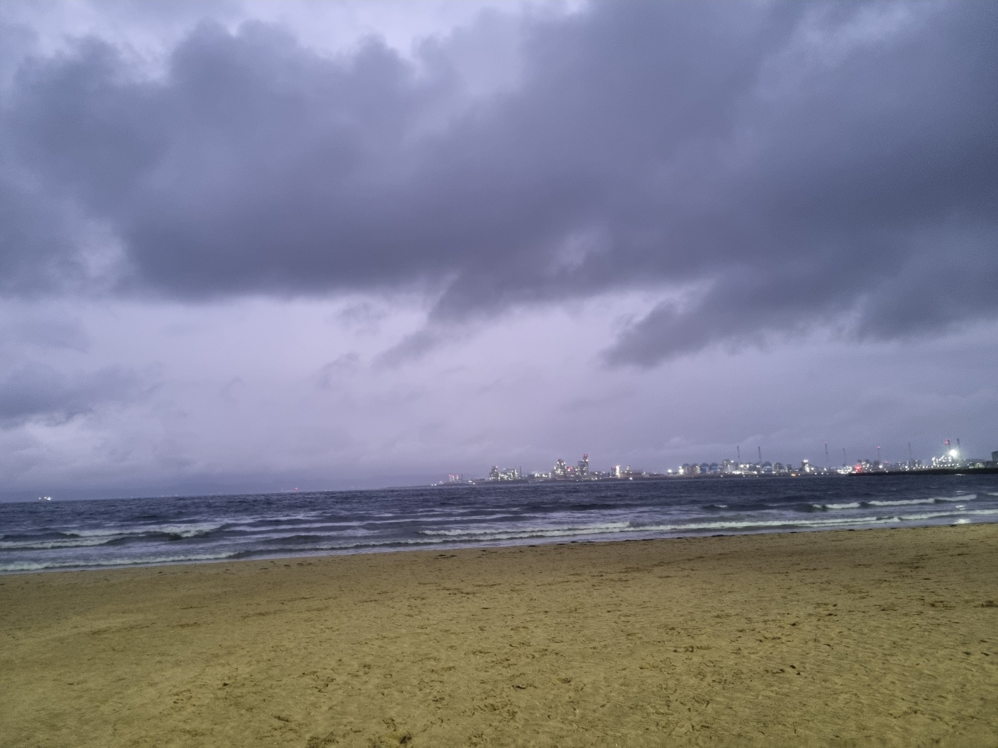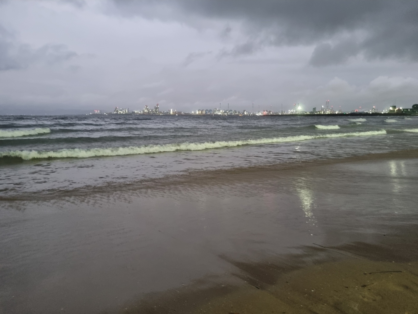 파도가 올라오는 바닷가,, 저 앞에 포스코가 보인다.