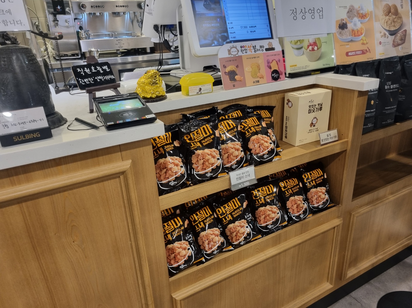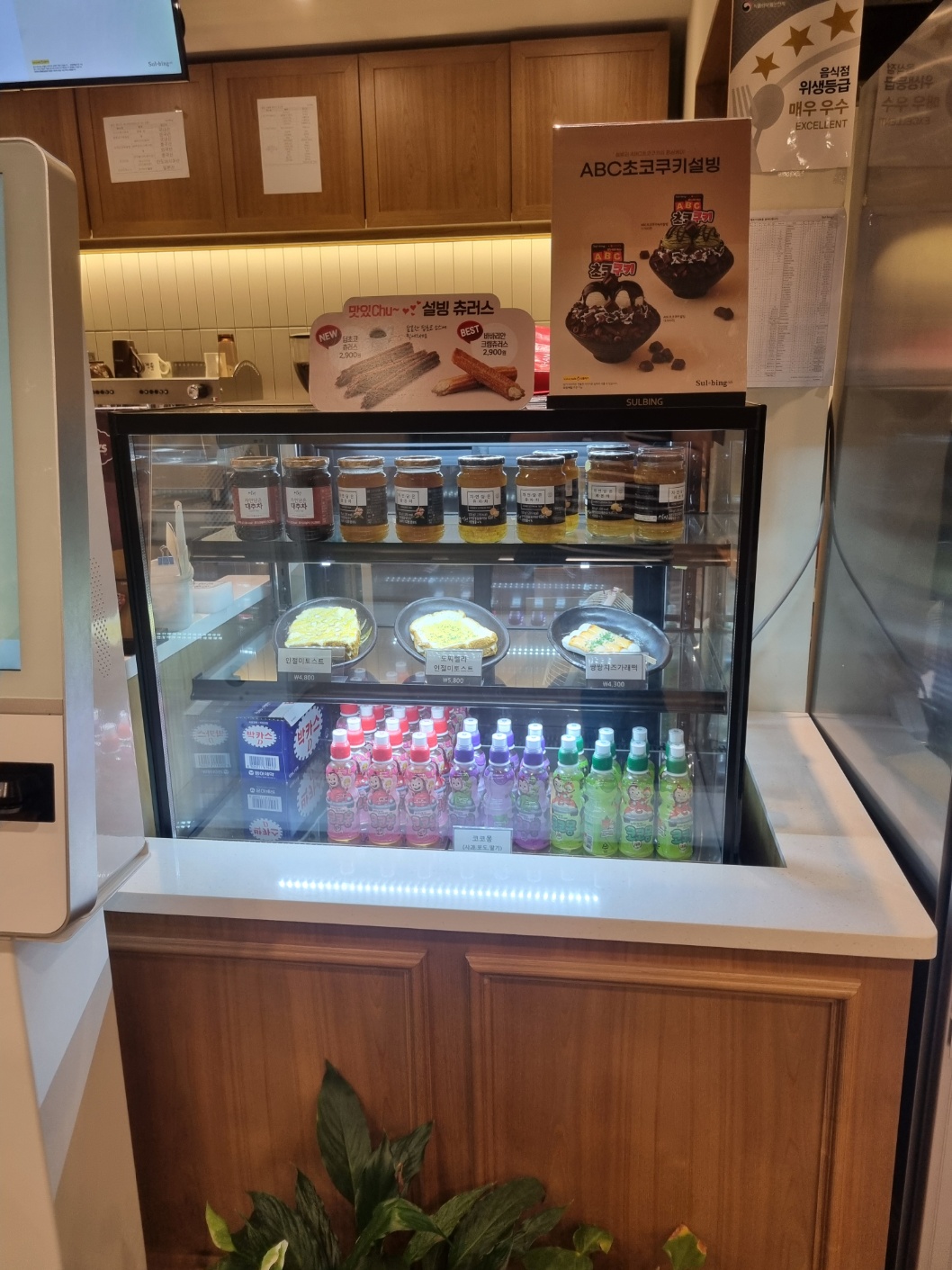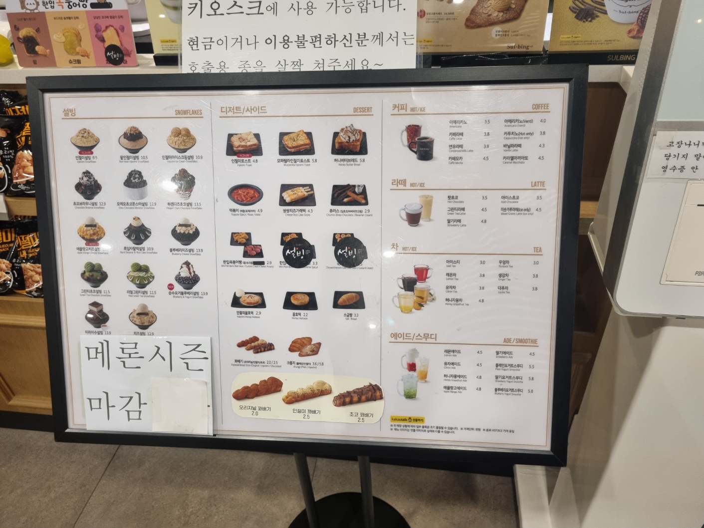 가게에는 키오스크가 있고 앞에 메뉴판이 있습니다. 설빙용 떡볶이와 붕어빵도 있어 냉장보관하다 끼니로도 떼울수 있습니다. 그리고 인절미 스낵도 있습니다.