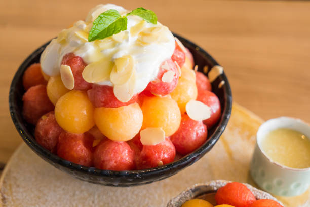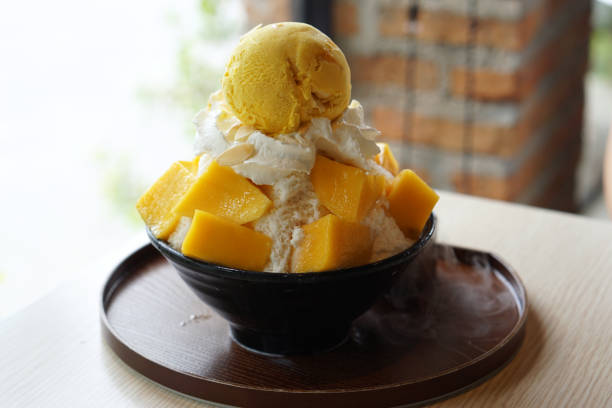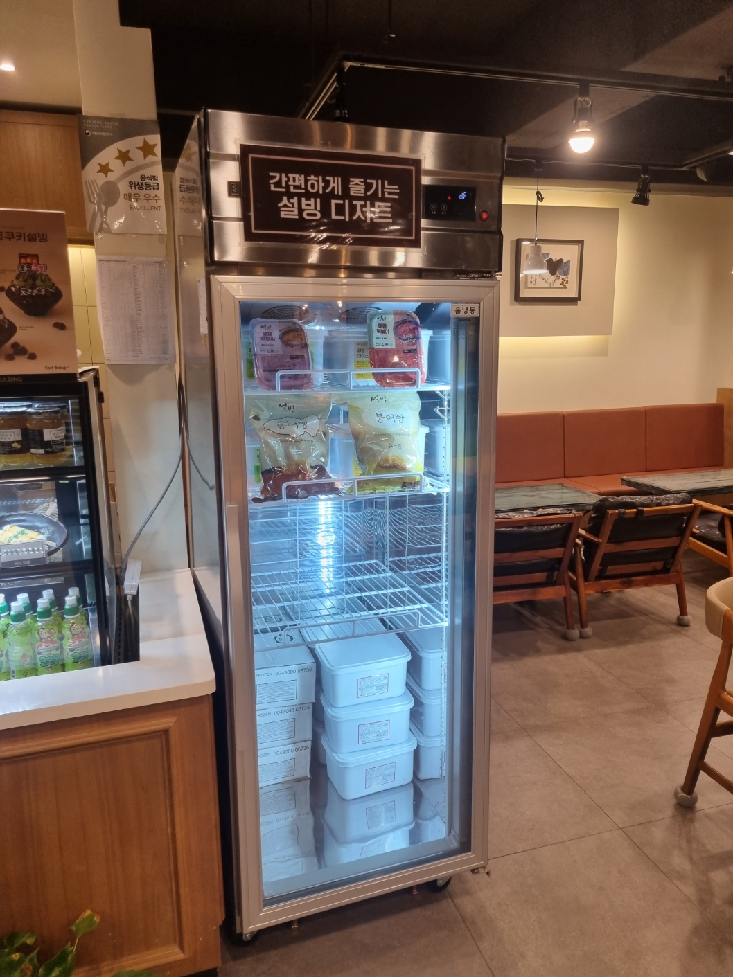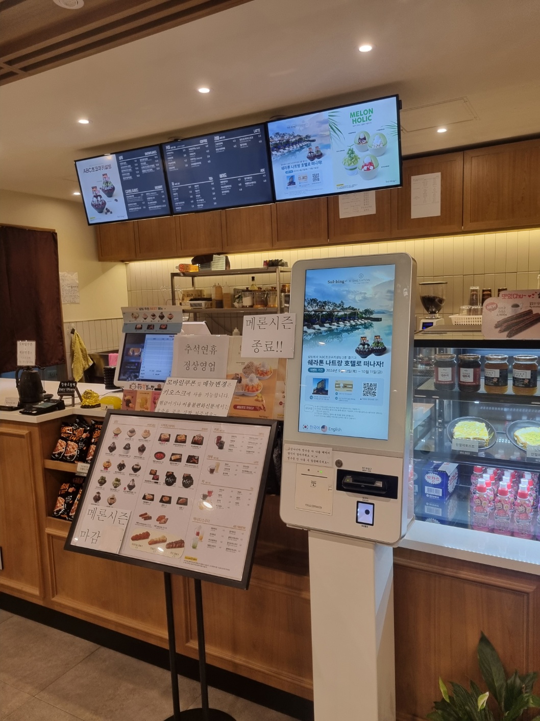 가게에는 키오스크가 있고 앞에 메뉴판이 있습니다. 설빙용 떡볶이와 붕어빵도 있어 냉장보관하다 끼니로도 떼울수 있습니다. 그리고 인절미 스낵도 있습니다.