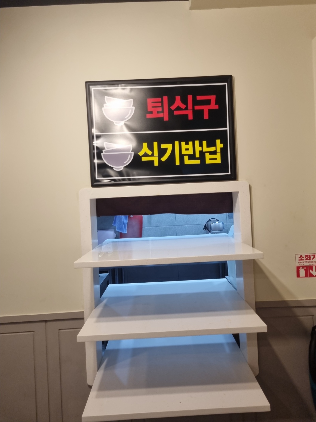 가게에는 테이블이 많이 구비되어 있고, 왼쪽으로 가면 식기 반납구가 있습니다.