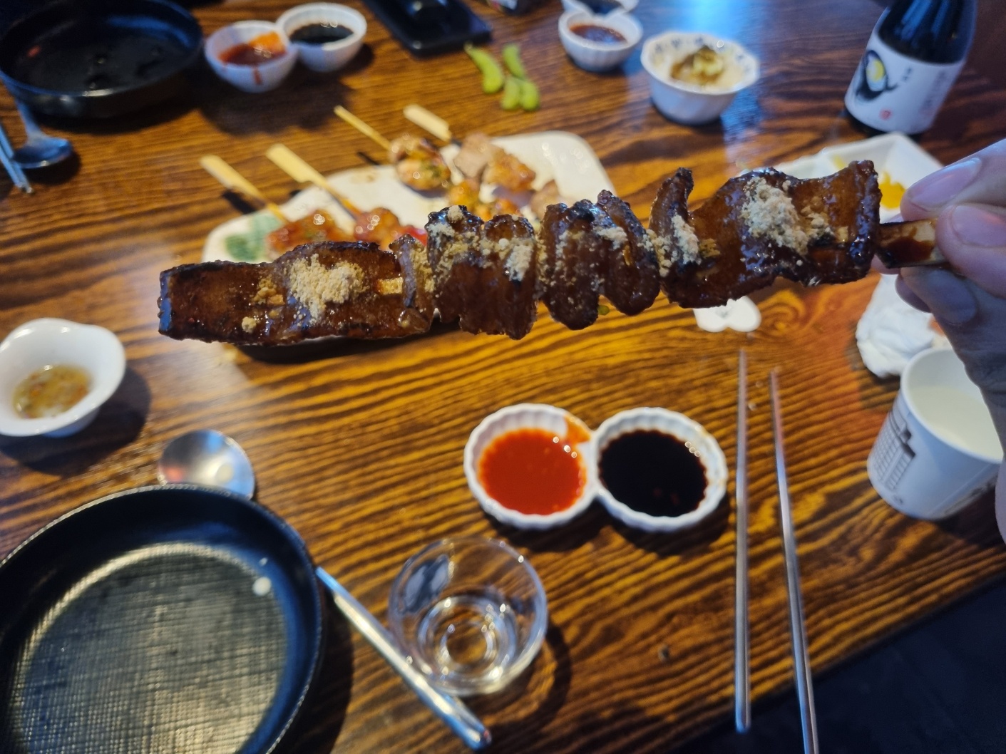 돼지껍데기 꼬치와 베이컨 말이 꼬치도 쫀뜩하고 맛있었네요 ㅋㅋ