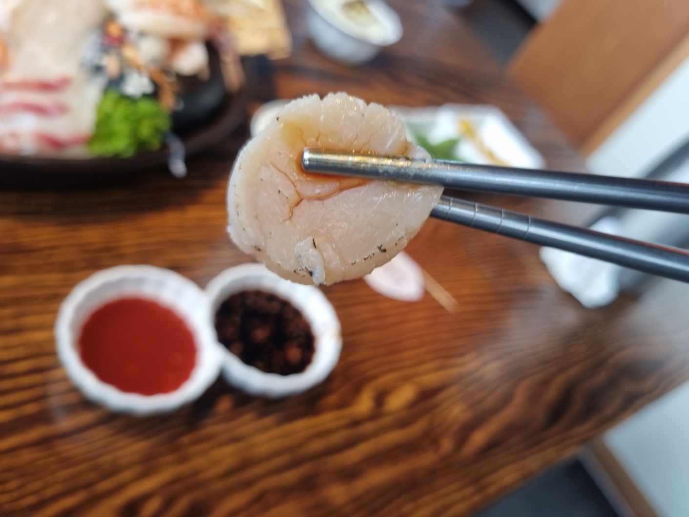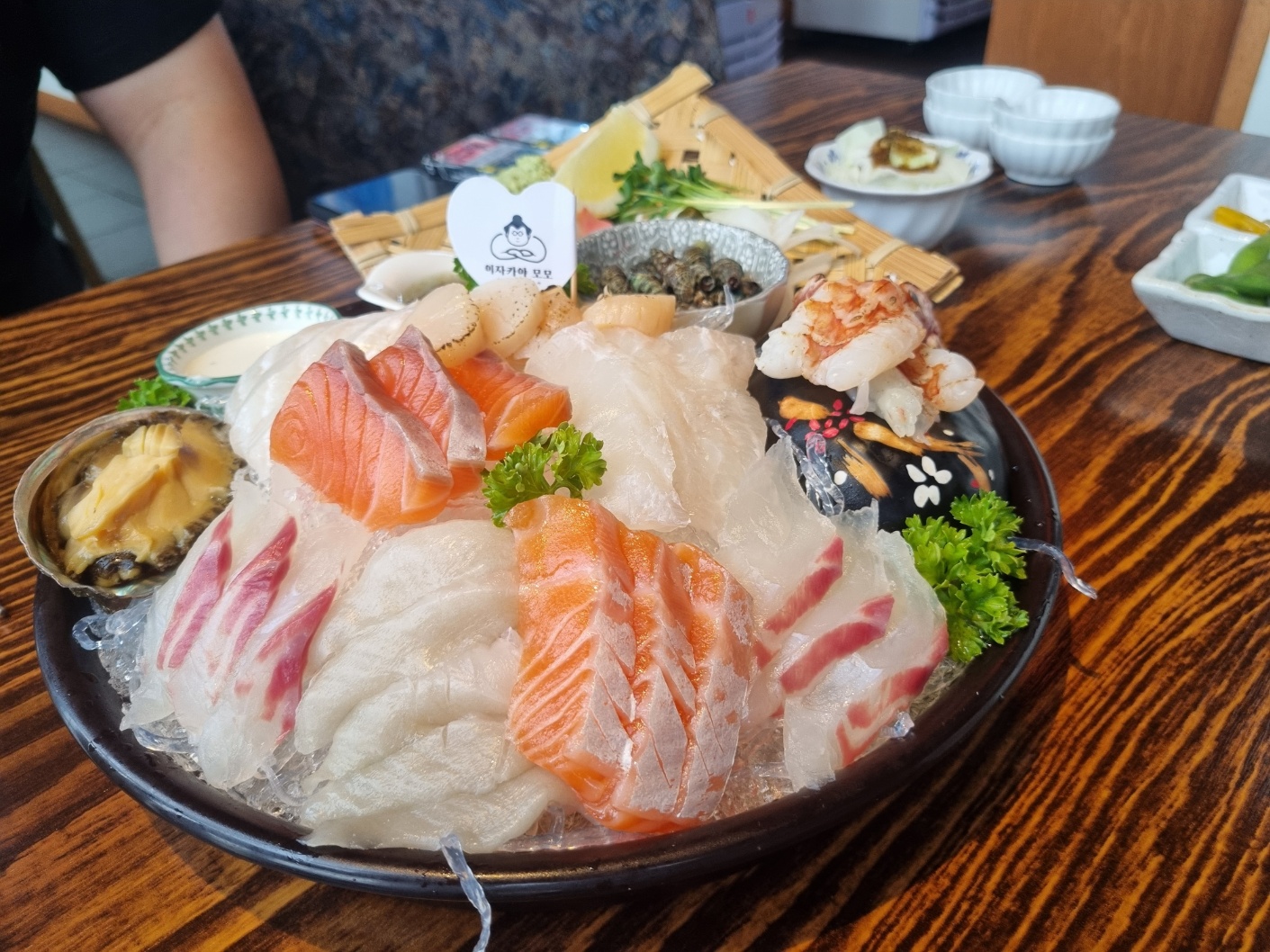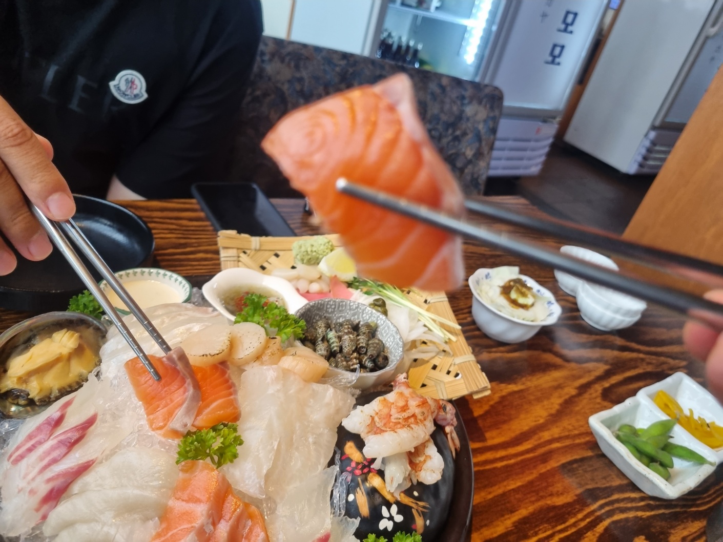 드디어 나온 모듬사시미 ^^ 연어회가 부드럽고 먹을만 했고, 광어,새우, 전복, 키조개완자도 맛있었다.
