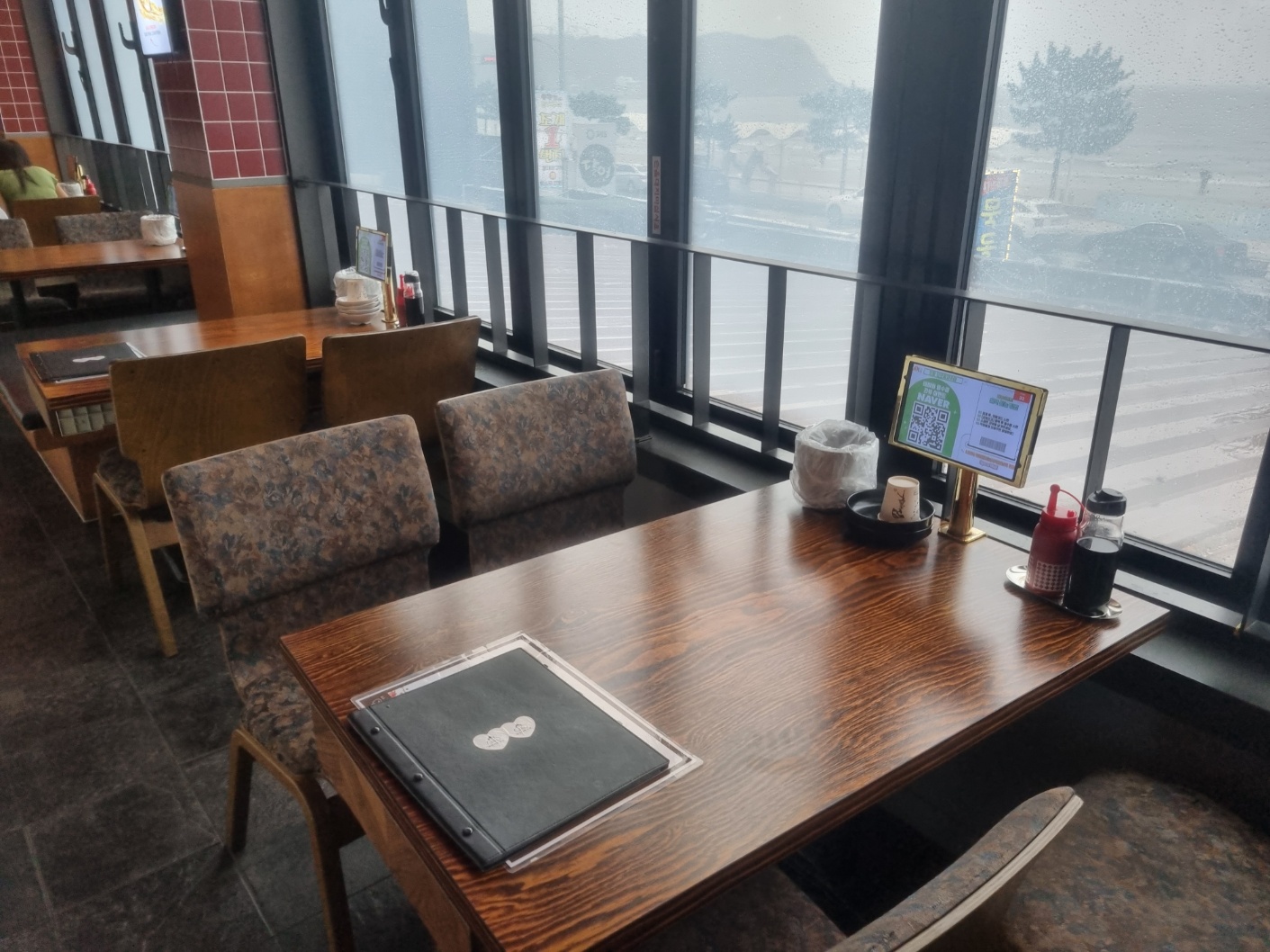 가게 내부로 들어가보니 넓은 가게와 테이블이 구비되어 있고,, 포토존이 있어 흔적 남기기도 좋고요 바다뷰가 있어 바다를 보면서 식사하기 좋은 가게입니다.