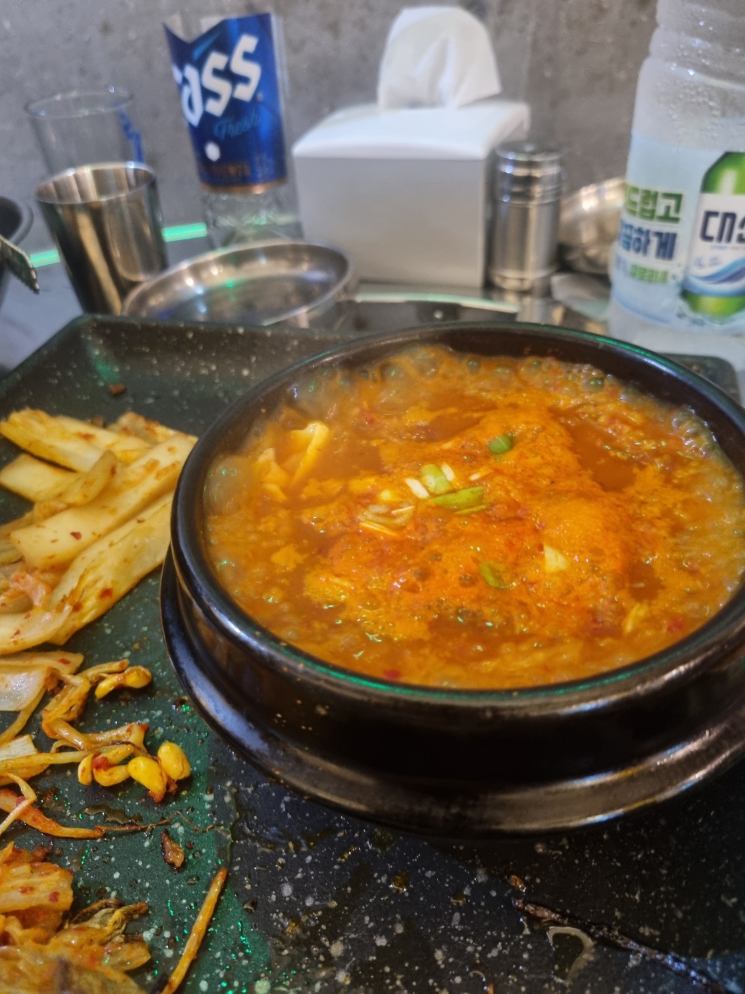 식사로 김치짜글이를 시켜 먹었다.