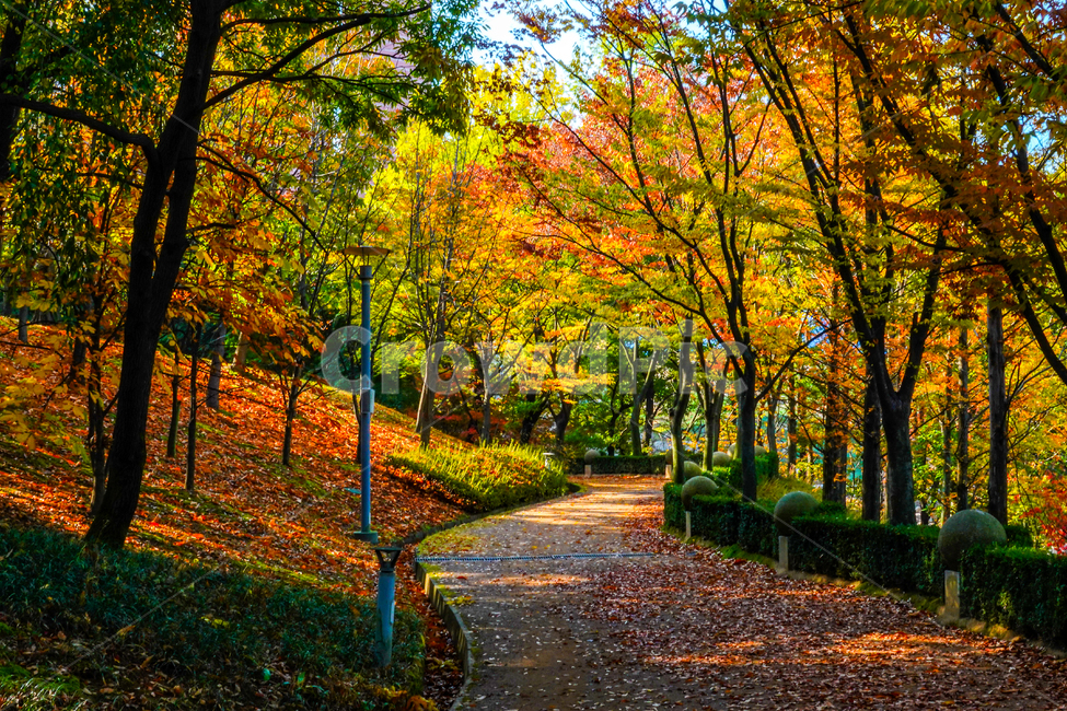 단풍 명소: 가을철 붉은 단풍과 노랗게 물든 은행나무가 숲길을 수놓음