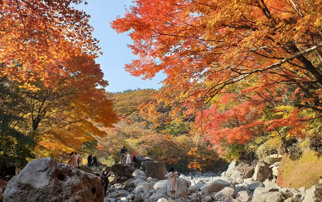 가을만 되면 잎이 붉고 노랗게 물든 나무들이 계곡을 둘러싸며, 자연이 그리는 가을 풍경의 정수를 보여줍니다.T