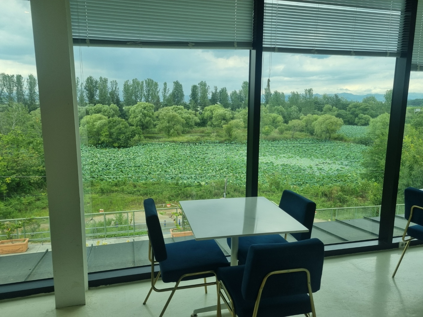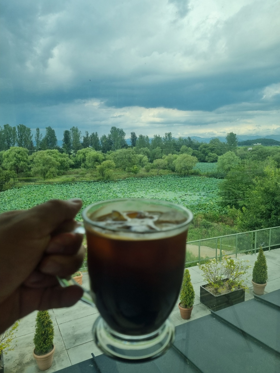 커피를 주문하고 연꽃과 저수지 뷰가 보이는 3층으로 올라갔다.