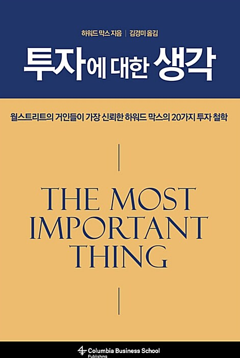 오크트리캐피털매니저먼트의 대표 하워드 막스의 책(투자에 대한 생각)의 원제는 The most important thing이다. 원제에선 thing이라는 단수 명사가 사용됐지만 사실 이 책에는 20가지에 이르는 투자 원칙들이 실려 있다. ‘가장 중요한 것‘이라는 뜻의 원제는 하워드 막스가 투자자로 일하면서 중요도가 제일 높다고 실려 있다. 가장 중요한 것이라는 뜻의 원제는 하워드 막스가 투자자로 일하면서 중요도가 제일 높다고 여겨지는 요소들을 기록한 메모를 의미하고,