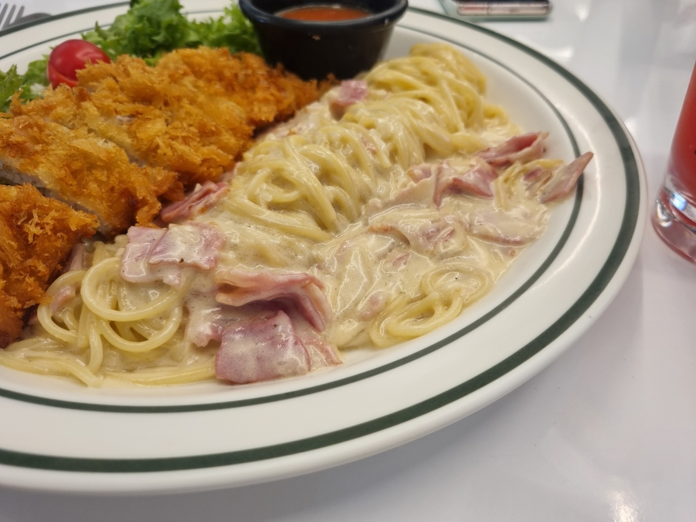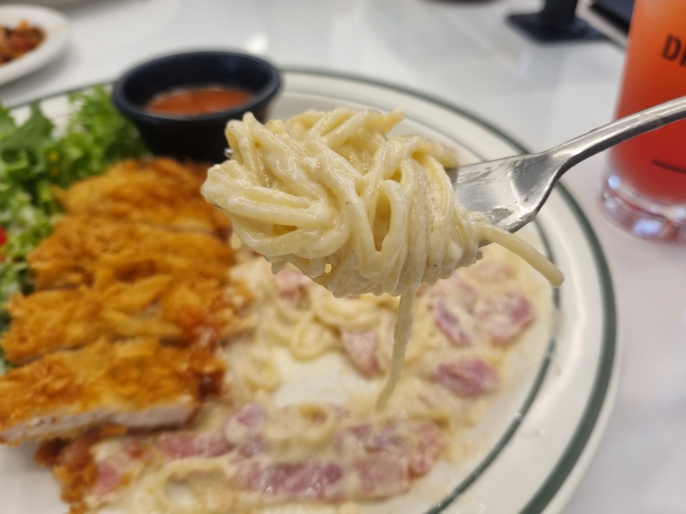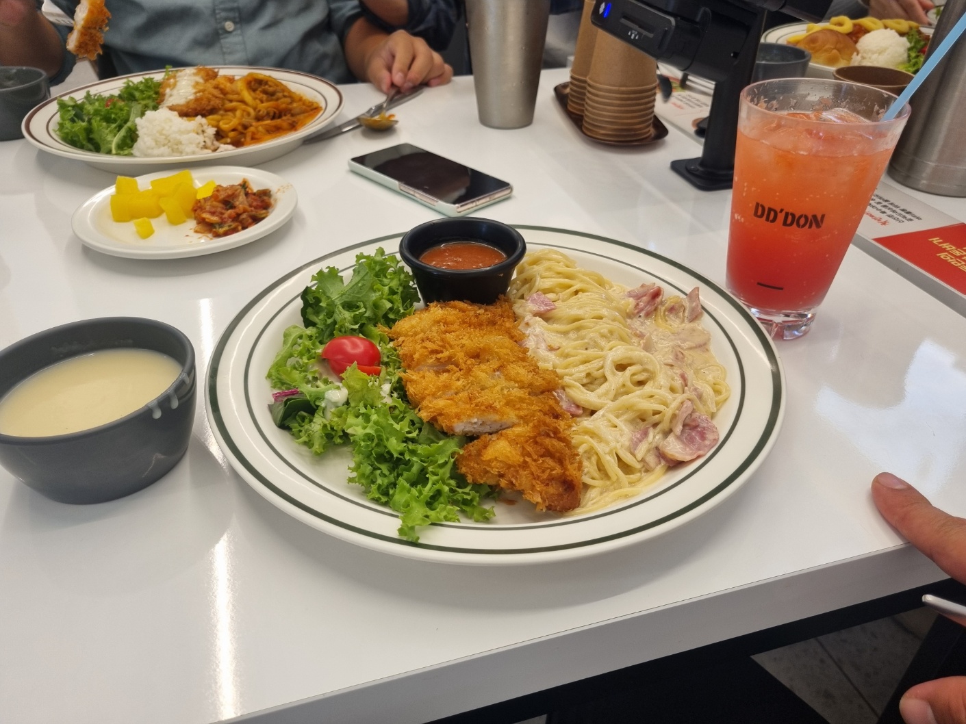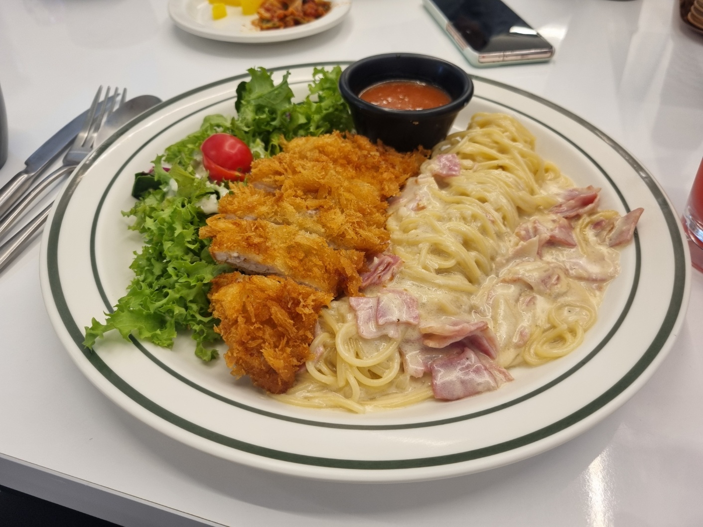 크림파스타는 부드러워 먹을만하고 돈까스도 바싹하고 맛있었다.