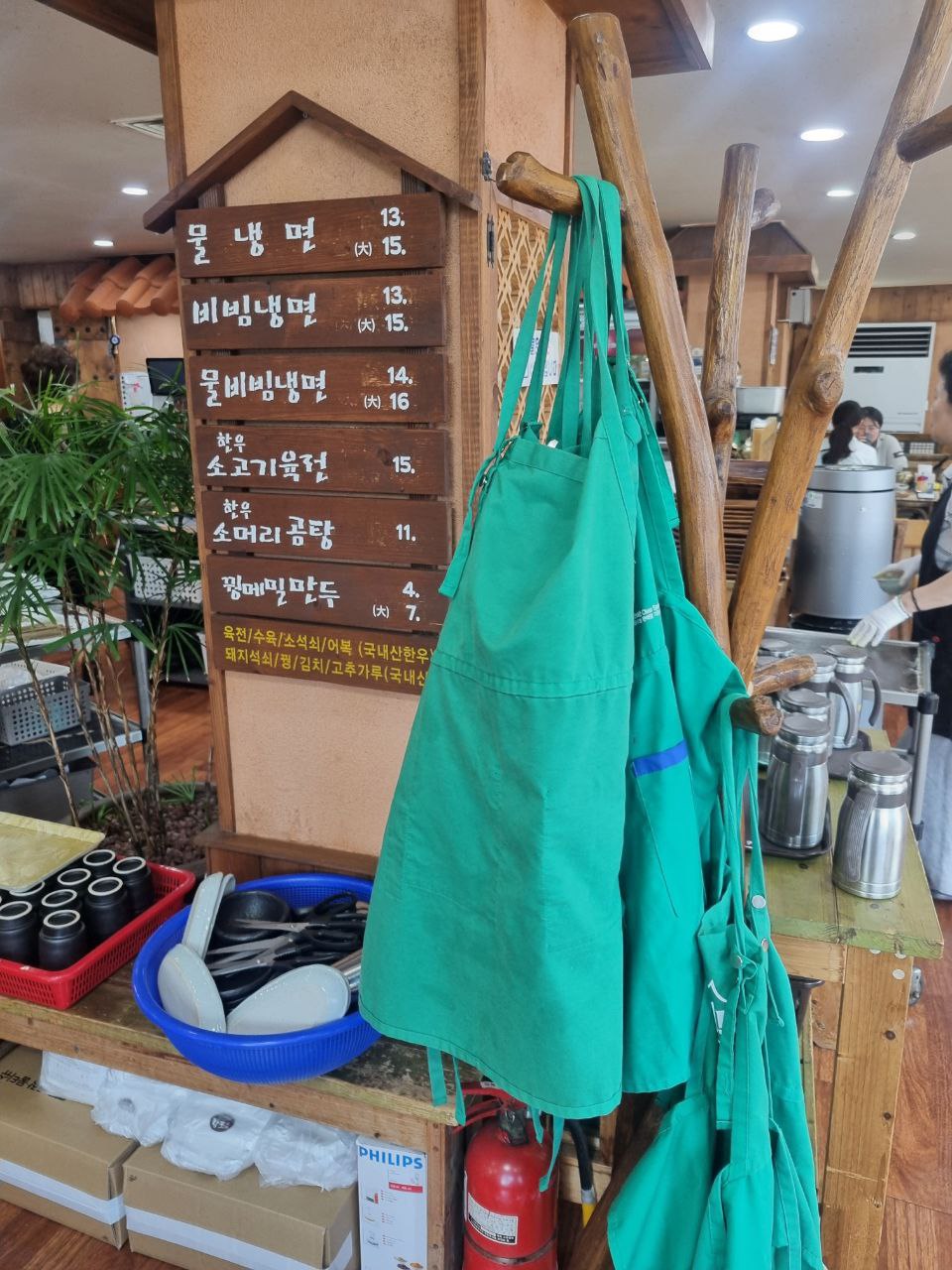 자리 옆에는 앞치마 옷걸이가 자리를 차지하고 있어요