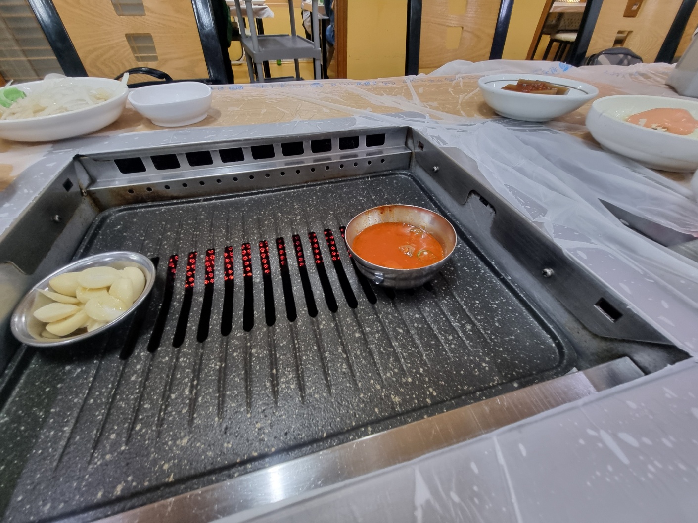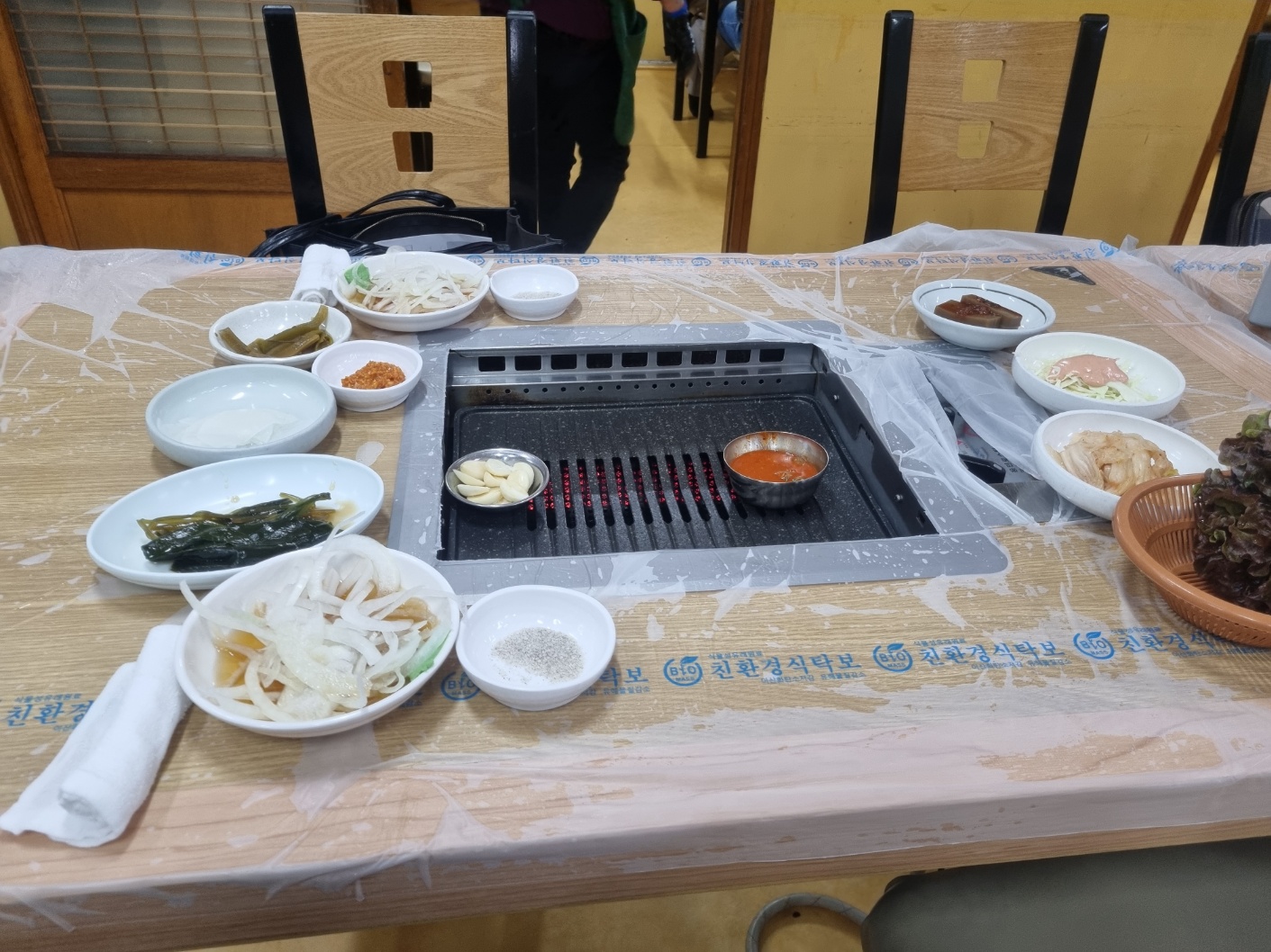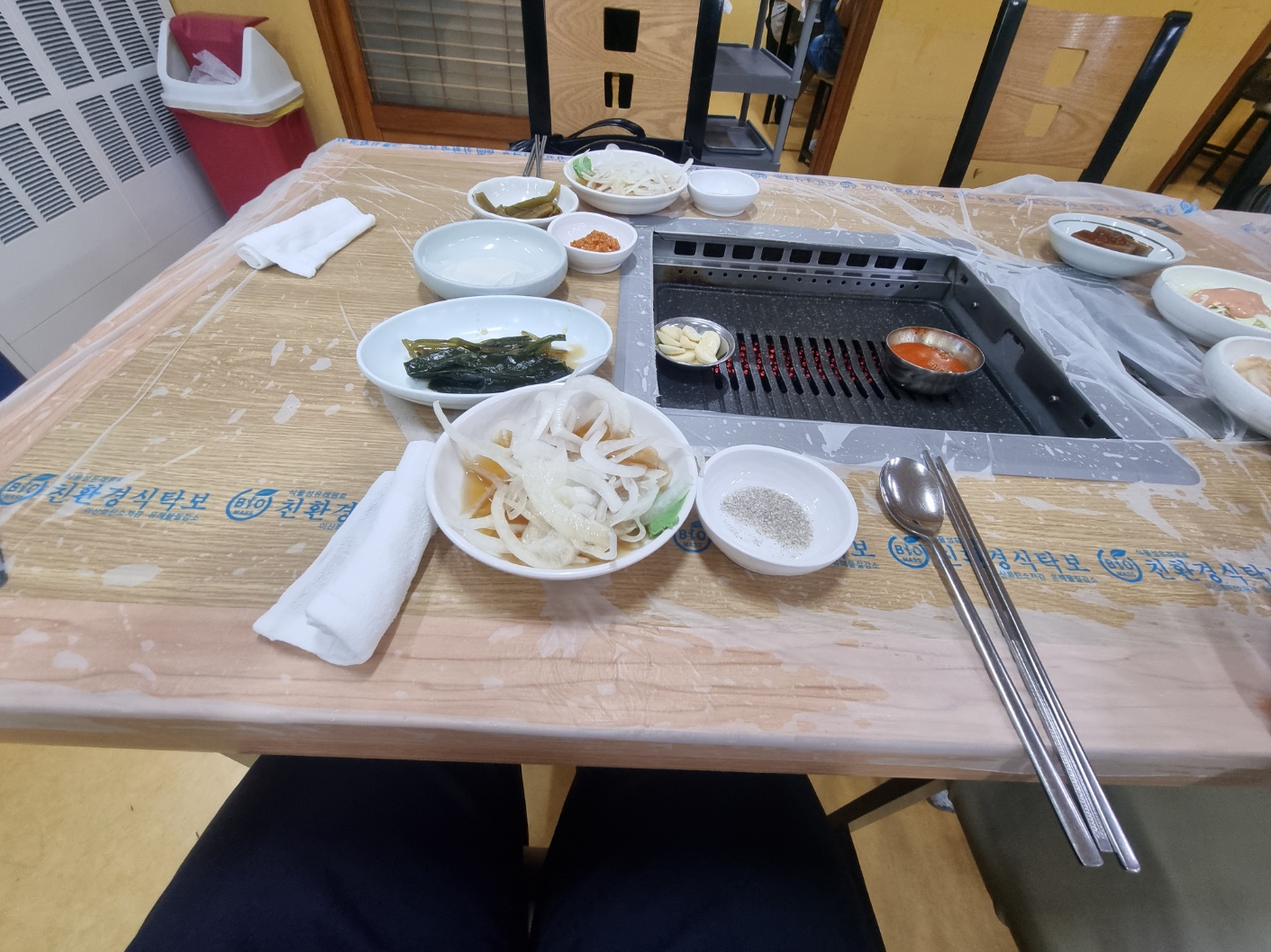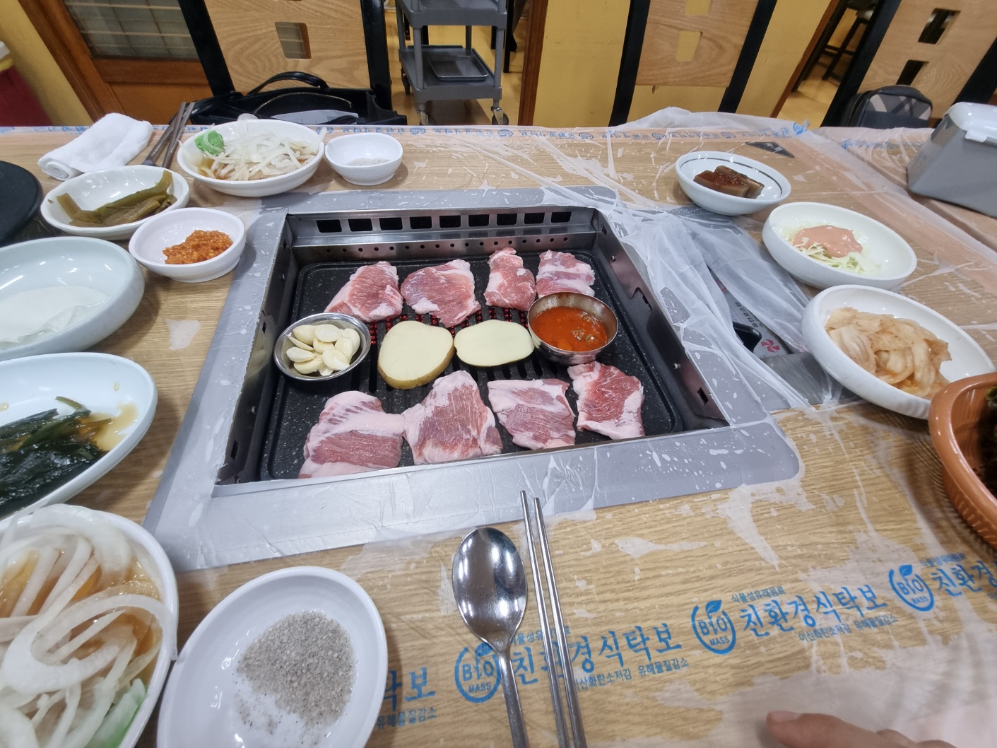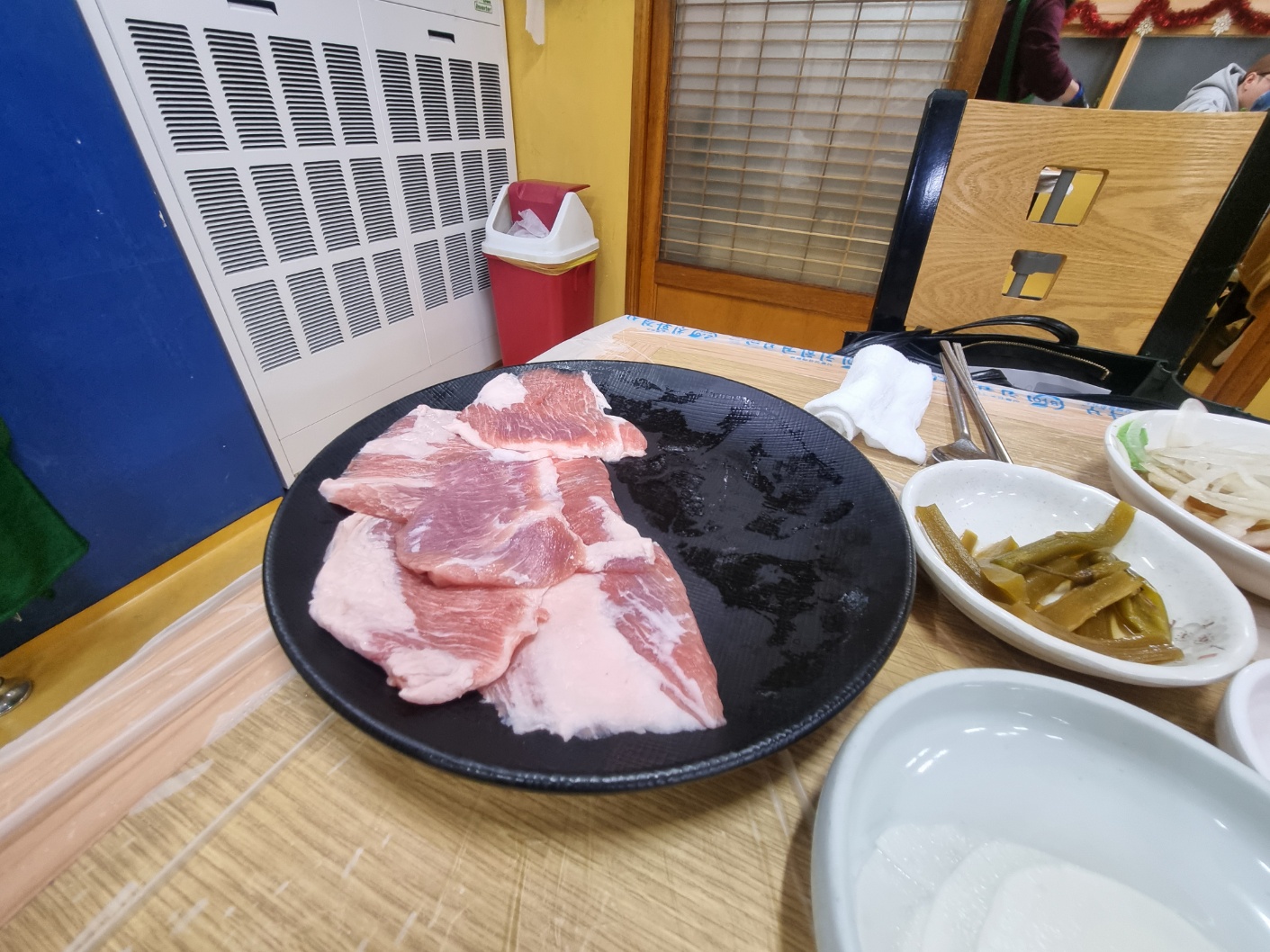 오자마자 상차림했고, 멸치젓이 올려져 있다.