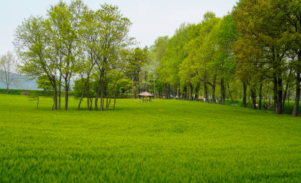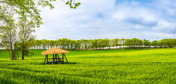 봄 (3월~4월) 어린 보리 싹이 자라나 들판에 섬세하고 밝은 녹색 카펫을 만듭니다 .