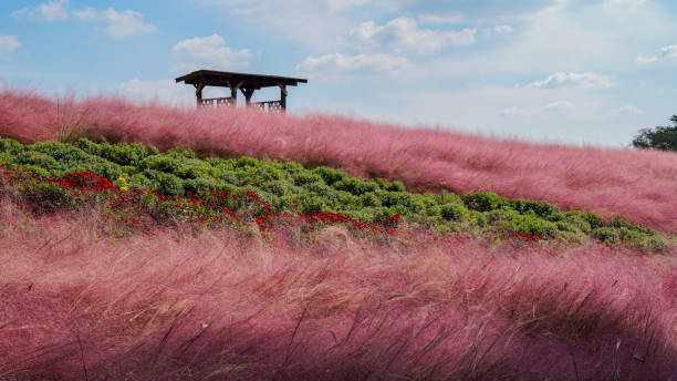 핑크 뮬리 길, 나무 벤치, 허브 정원과 분홍 억새가 어우러진 장면은 모두 인생샷을 남길 수 있는 스팟입니다. 특히 해질 무렵의 핑크 뮬리는 황금빛 햇살과 함께 환상적인 분위기를 자아냅니다.