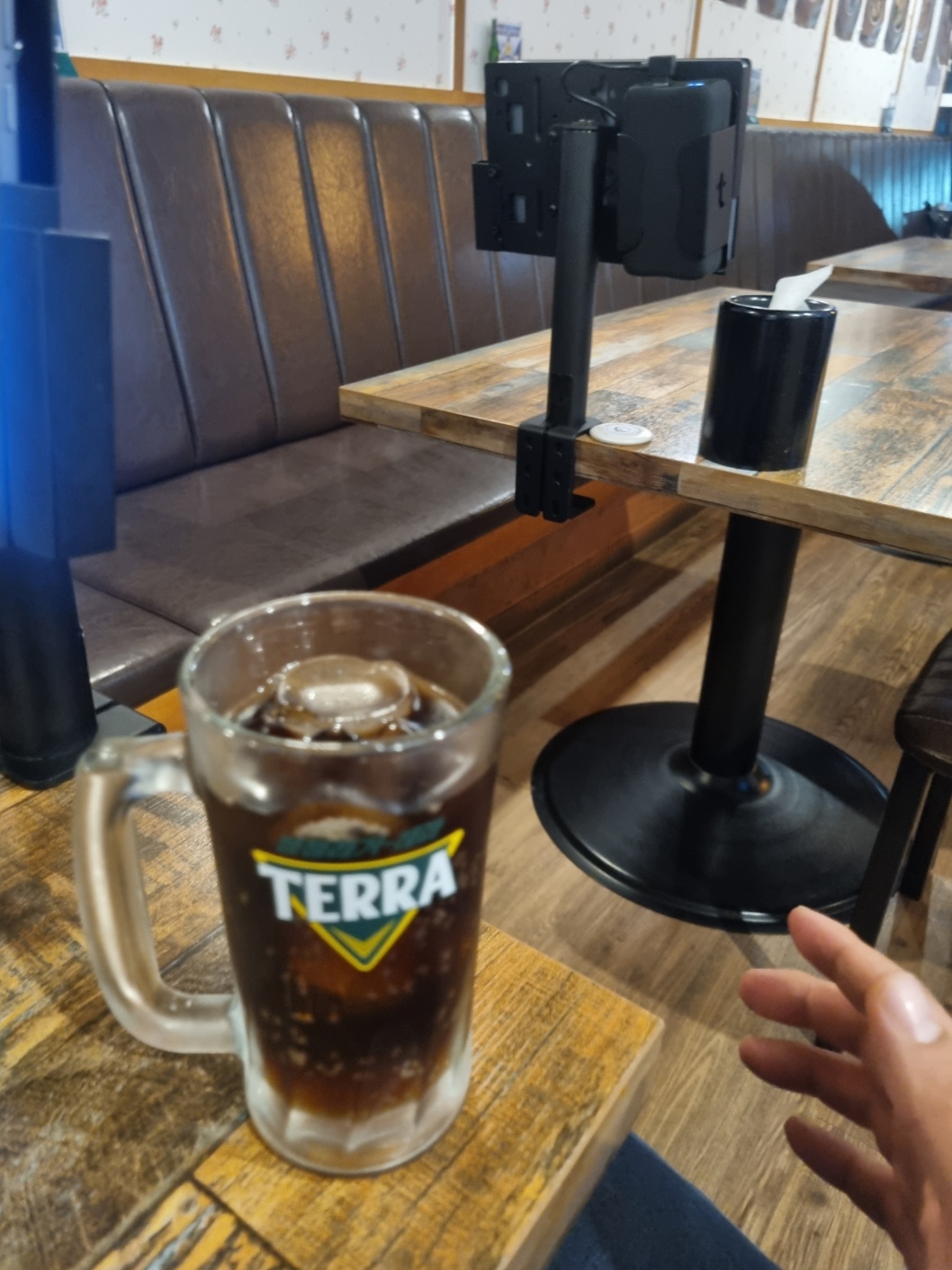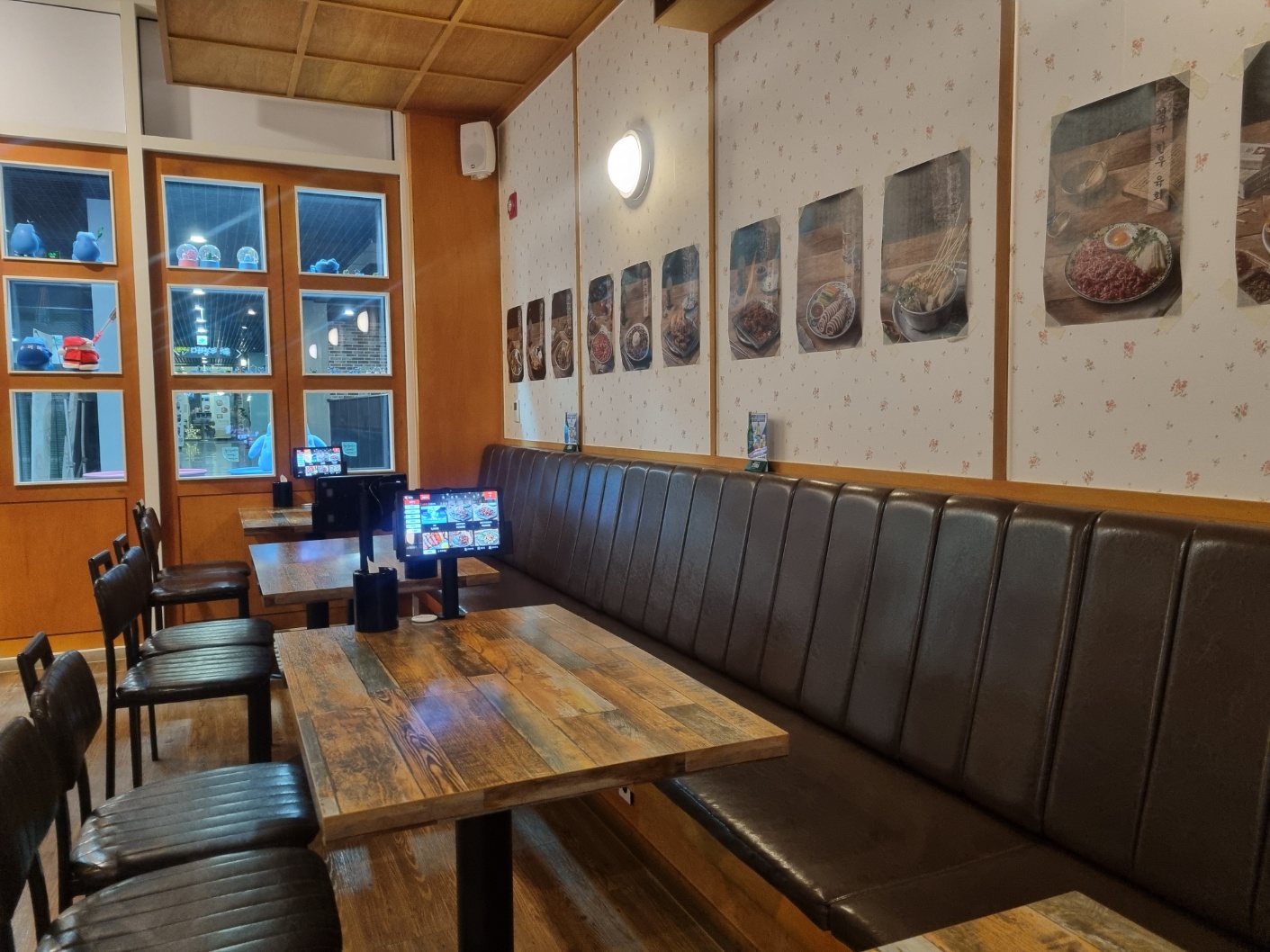 가게 내부에 들어가봤는데 작게 보이면서 많은 테이블이 있고, 단체석을 앉을수 있는 의자가 있고, 각 테이블에 키오스크가 구비되어 있다.