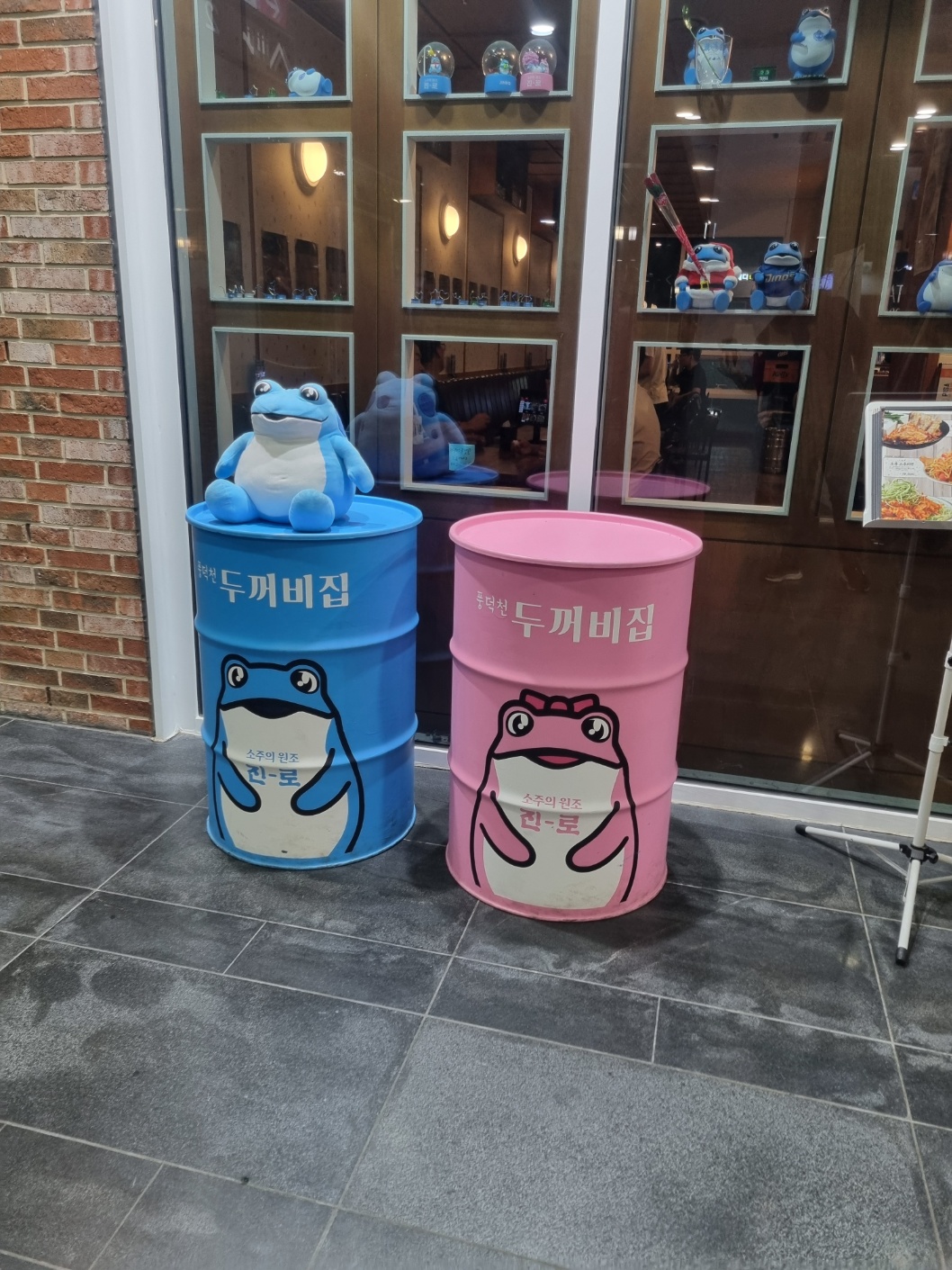 가게 옆에는 명판과 앞에서 안내하고 있는 두꺼비 인형과 드럼통이 구비되어 있습니다.