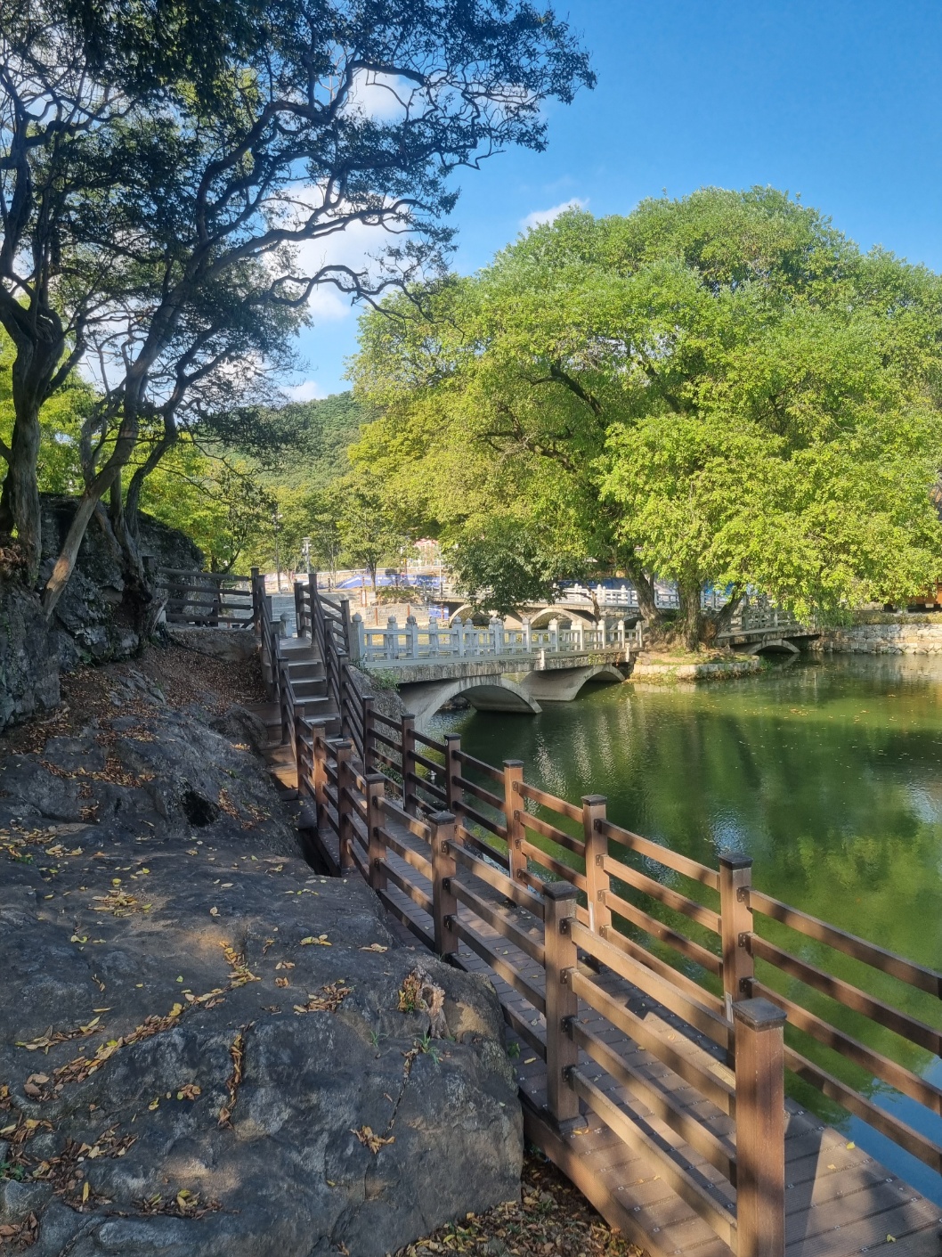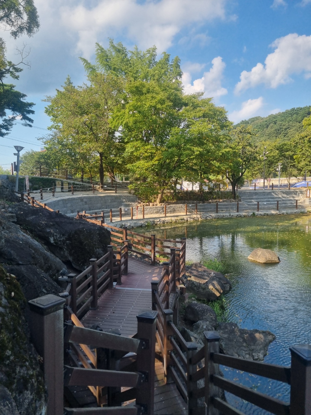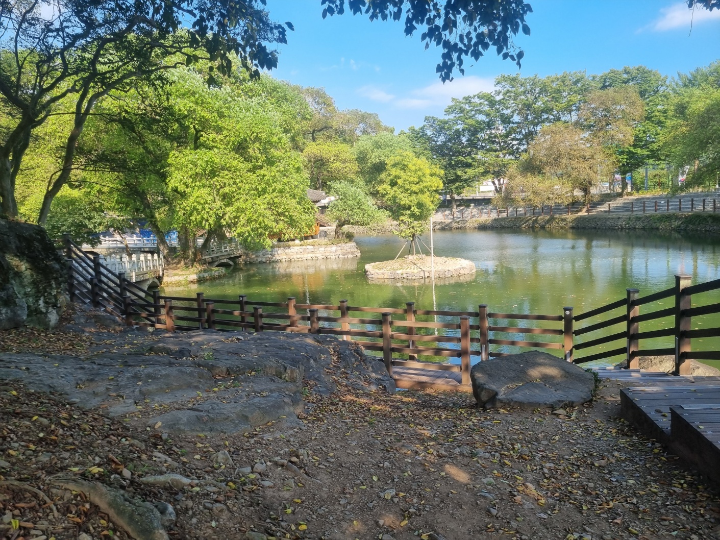 무진정 연못을 둘레로 산책길이 이어져 있다.