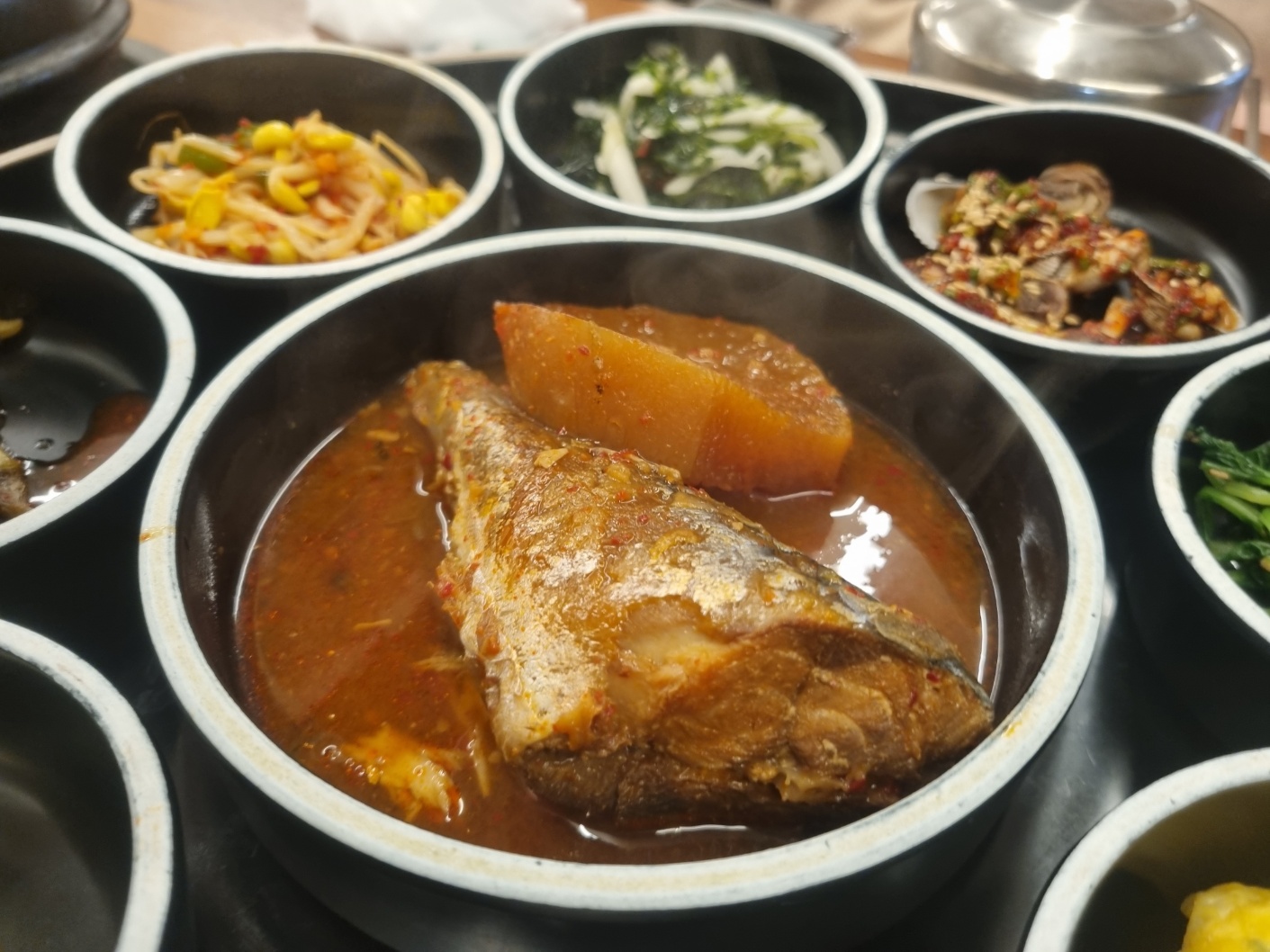 오기 전에 13개의 반찬이 왔다. 고등어조림, 부추전, 된장찌게. 나물, 계란말이등 나왔다.