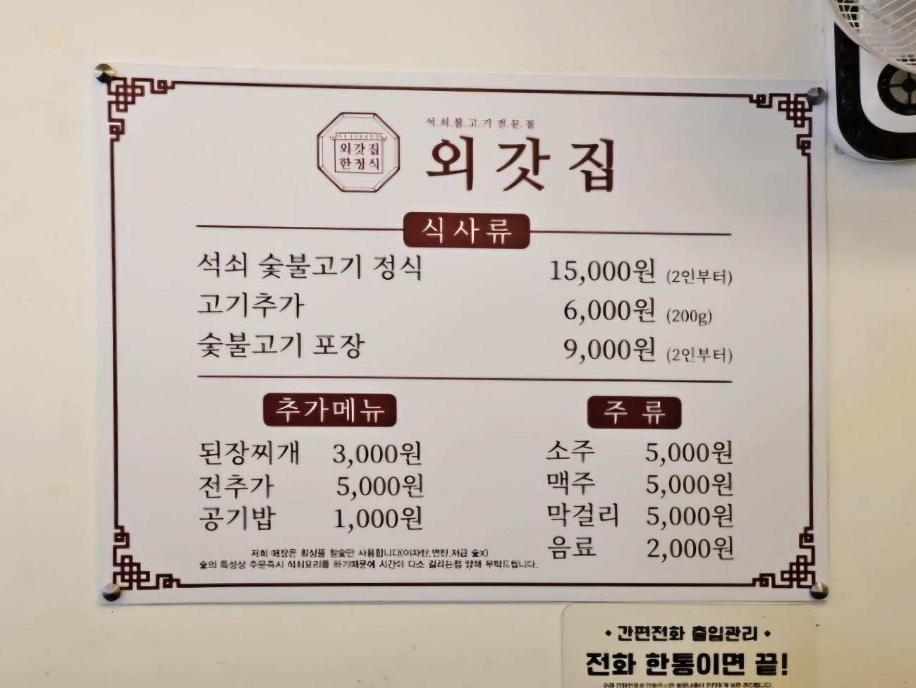 저희는 석쇠 불고기 정식 2인분을 주문했습니다.