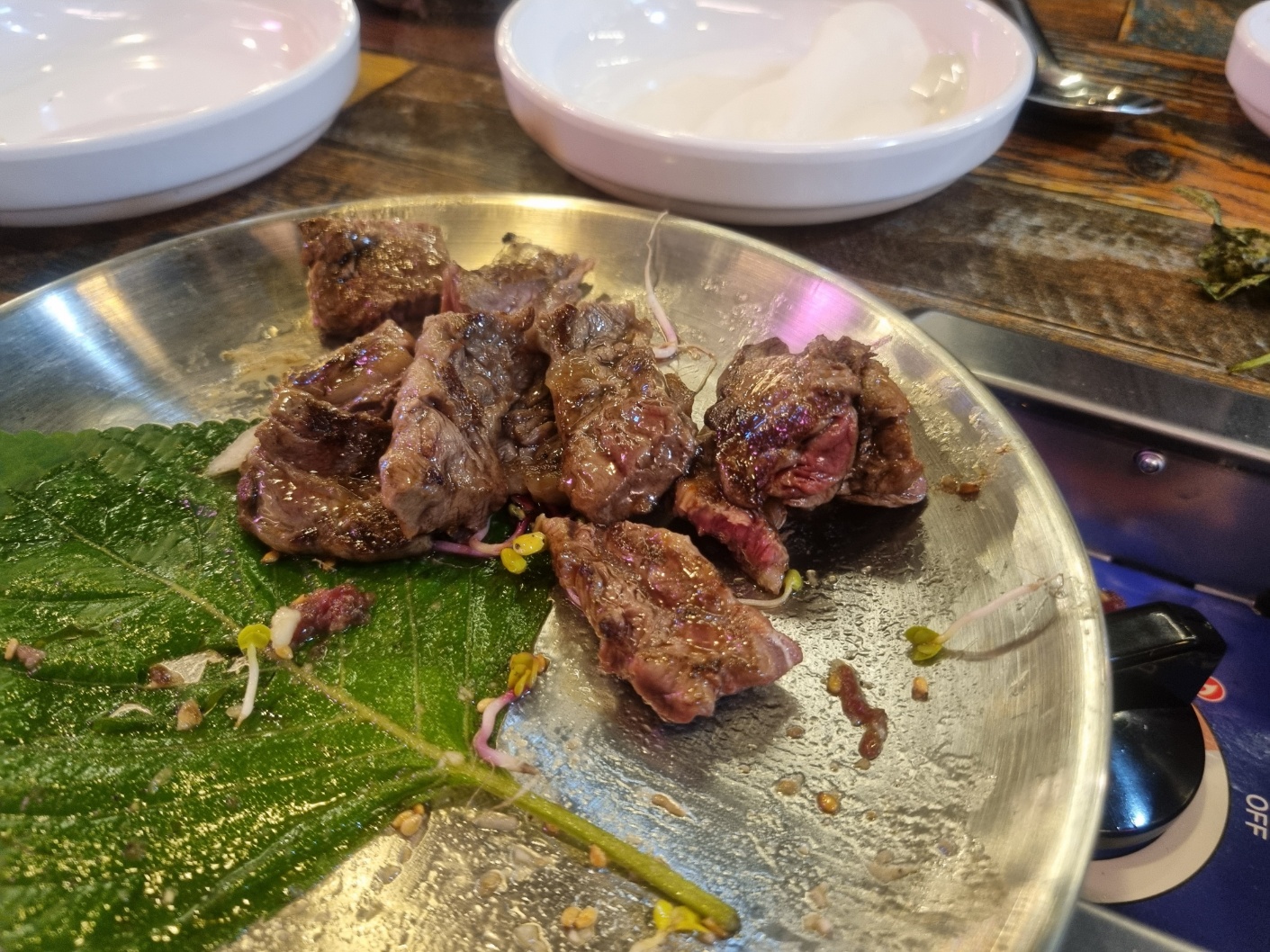 우리가 주문했던 한우모듬을 이제 굽기 시작했다.