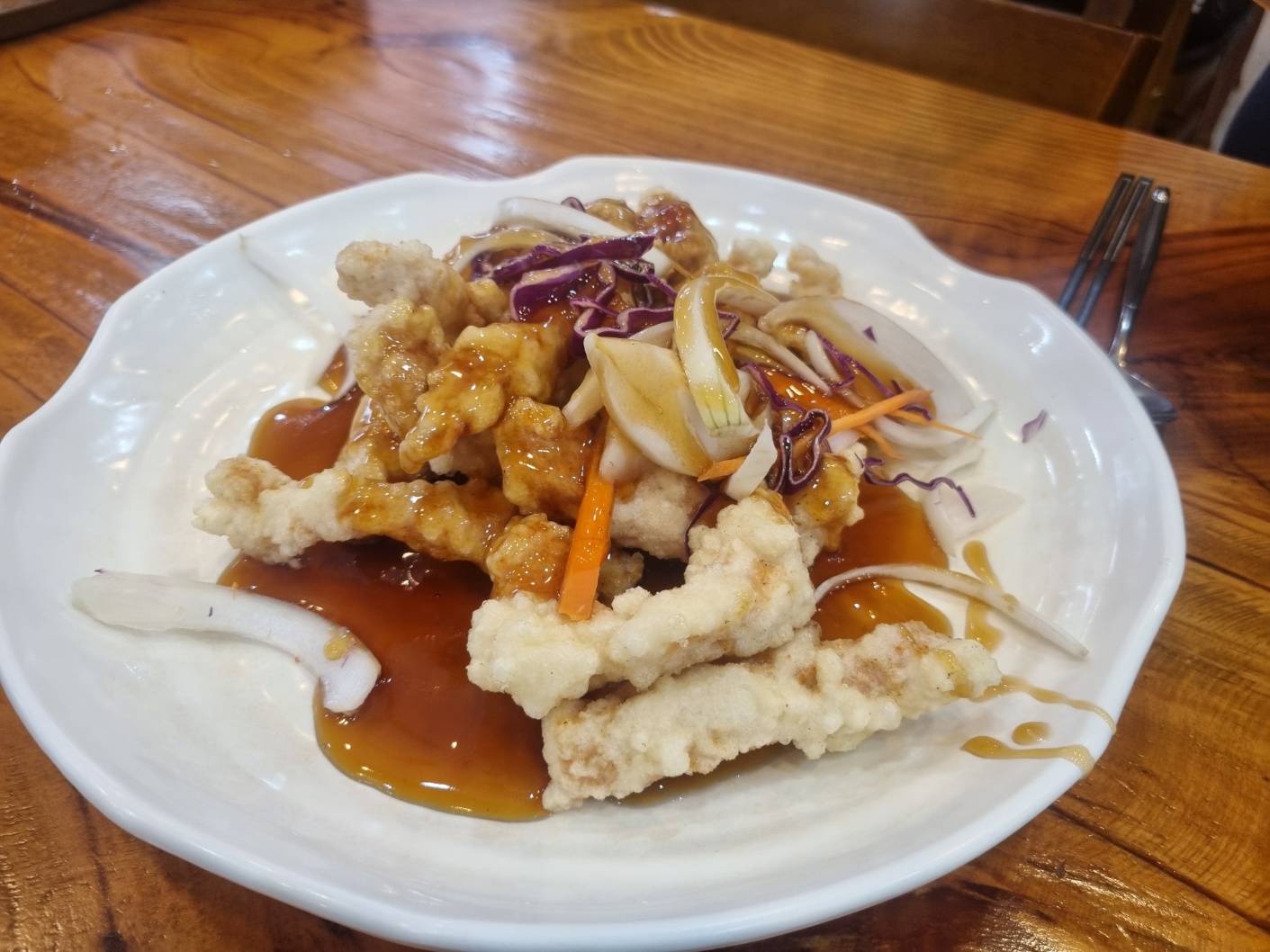 주문했던 미니탕수육과 야끼우동이 도착했다.
