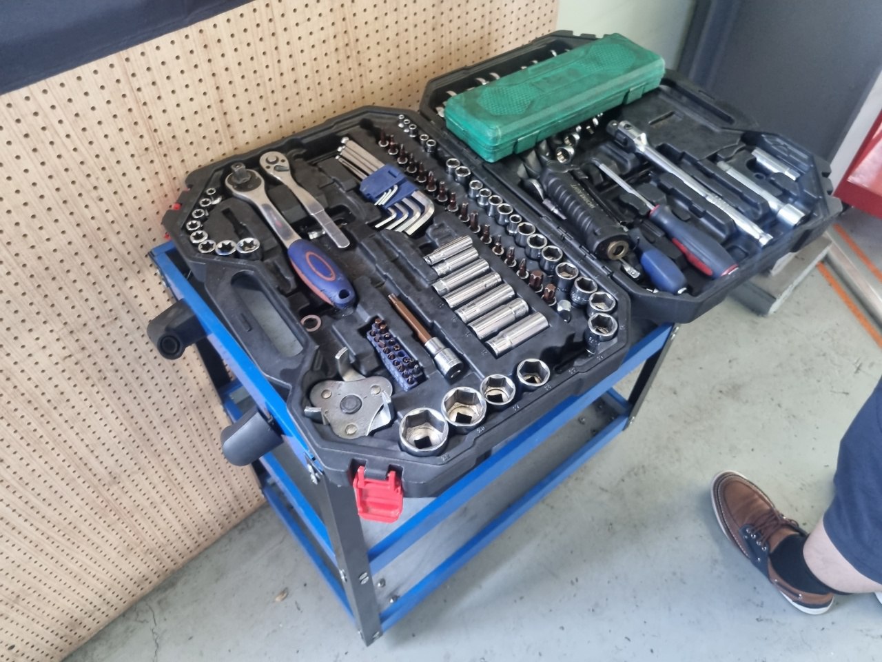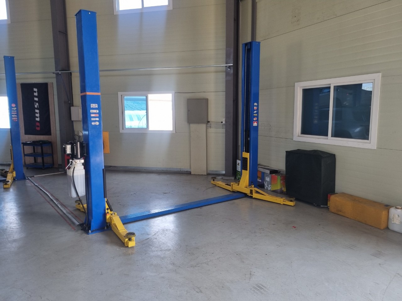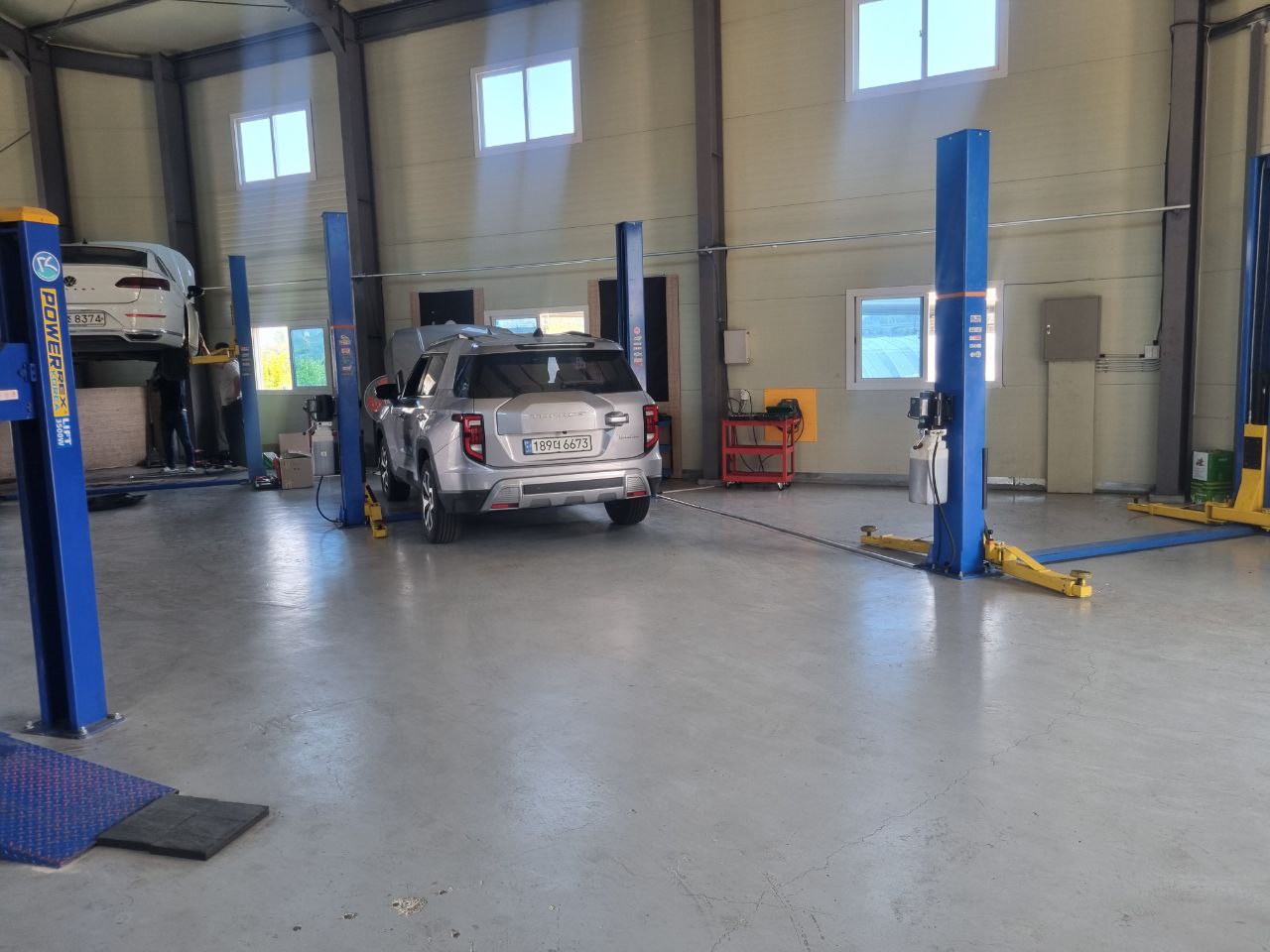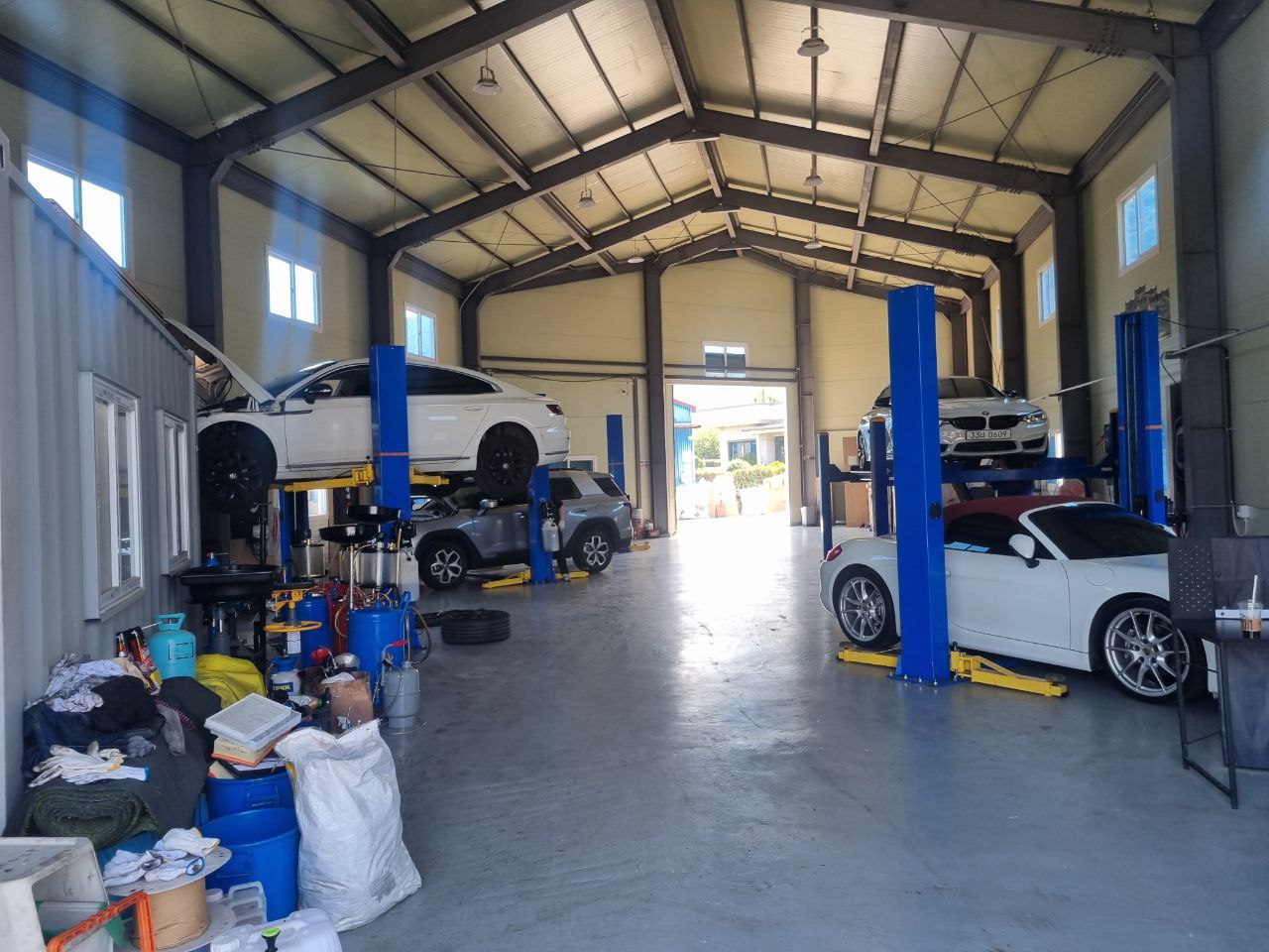 이 정비소에는 리프트가 6개 있고, 각 자리마다 셀프 공구가 비치되어 있다.