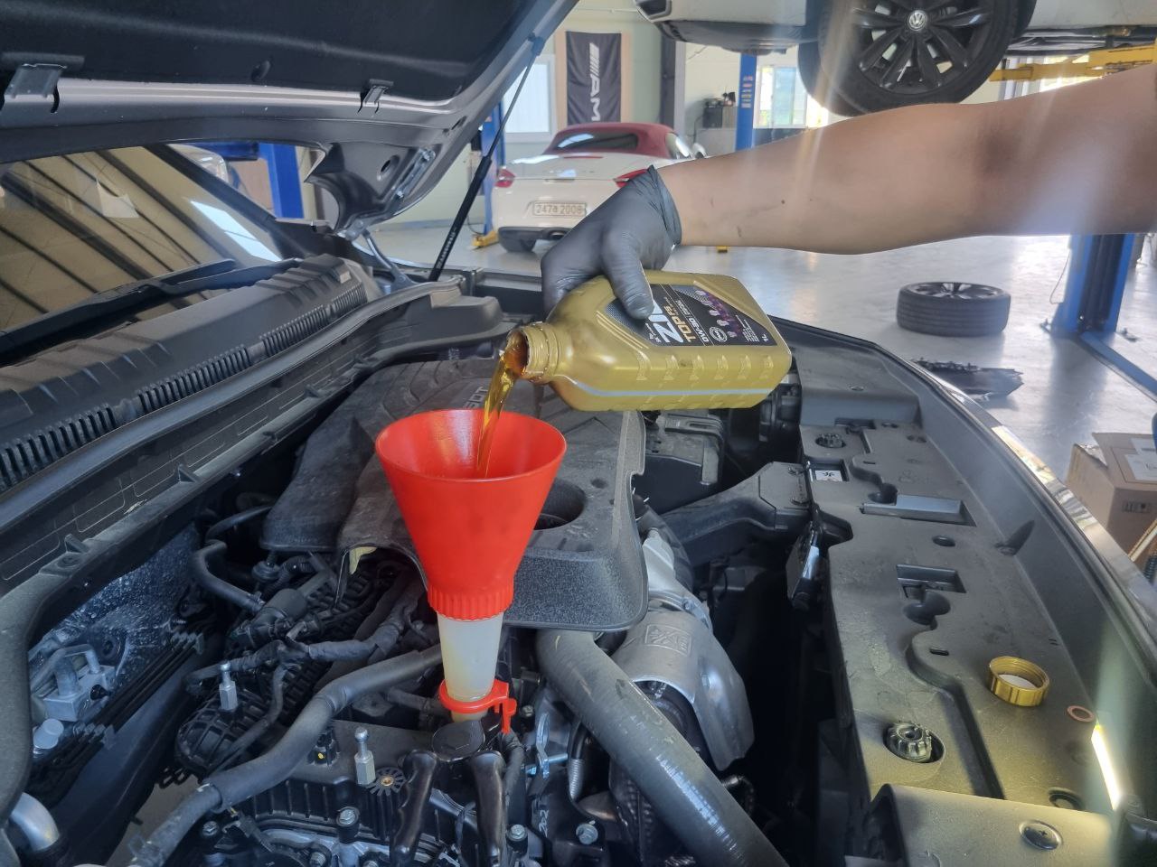 이제 엔진커버 분리하고 오일 주입용 깔데기를 설치후 새 엔진오일을 주입했다.