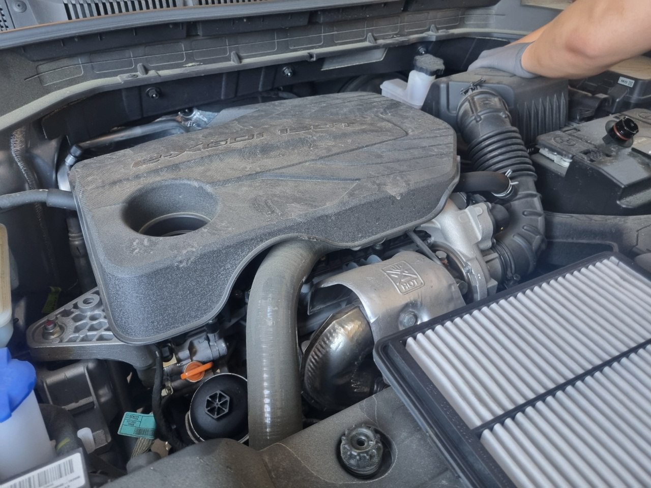 먼저 에어크리너를 교체후 엔진 오일의 열을 식히기 위해 엔진오일 주입구를 열어놓는다.